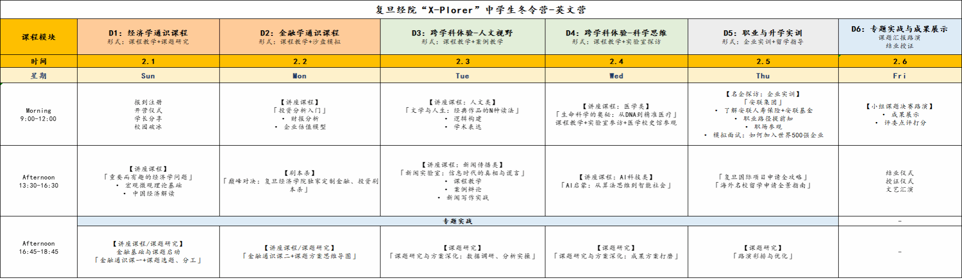 复旦经院“X-Plorer”中学生冬令营(英文授课)是复旦大学经济学院专为具有全球视野的优秀中学生打造的学术项目。我们提供经济与金融领域最前沿、最权威的课程内容,融合跨学科思维与实战训练,引领学生感受国际化一流商科教育的魅力,探索个人学术兴趣与未来发展的无限可能。