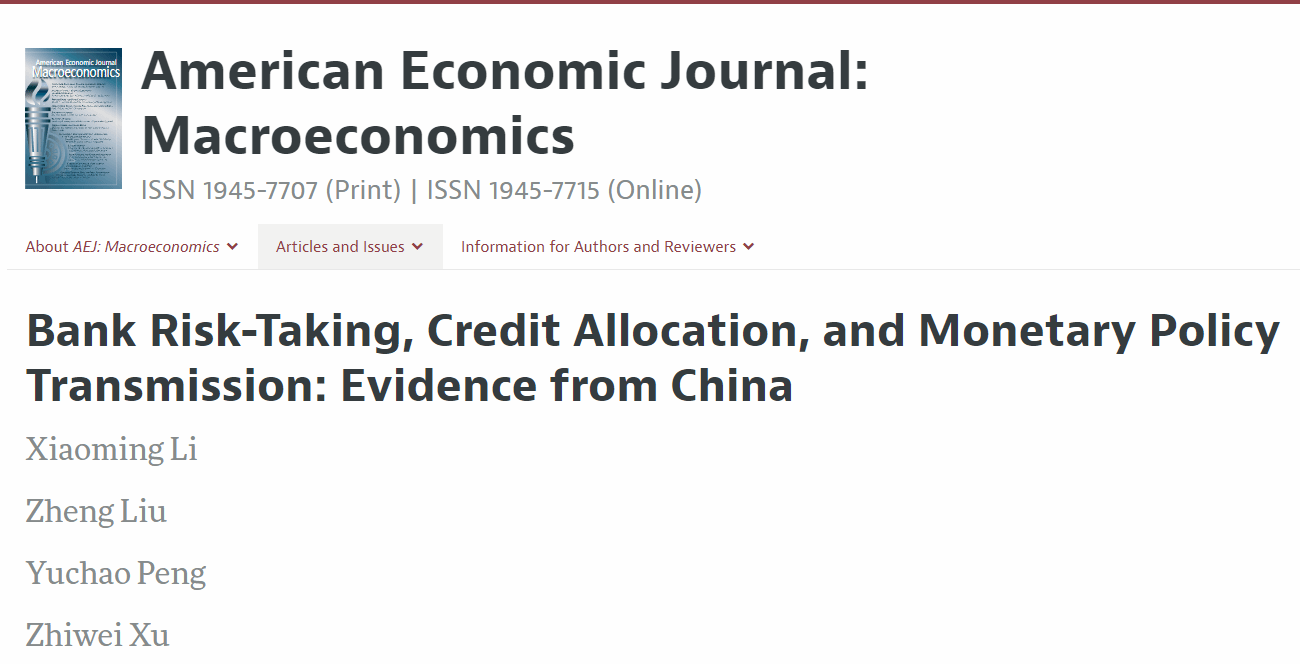 近期,复旦大学经济学院许志伟教授与三位合作者的研究论文 Bank Risk-Taking, Credit Allocation, and Monetary Policy Transmission: Evidence from China(银行风险承担、信贷配置与货币政策传导——来自中国的证据)在宏观经济学领域国际权威期刊American Economic Journal: Macroeconomics在线发表。