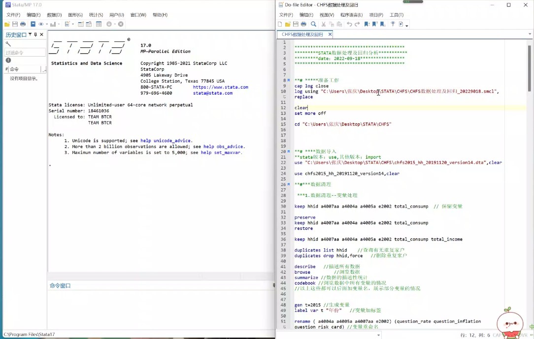 完成准备工作并导入数据后,就可以开始数据处理工作。在这一环节中,研究者可以根据自己的需要,进行变量、样本的筛选与整理。除了可以对变量进行标签、排序、格式转换等基本处理之外,还可以针对研究目的生成一些新的变量。随后,主讲人又展示了数据清理、同一年不同数据合并、跨年数据合并等操作。