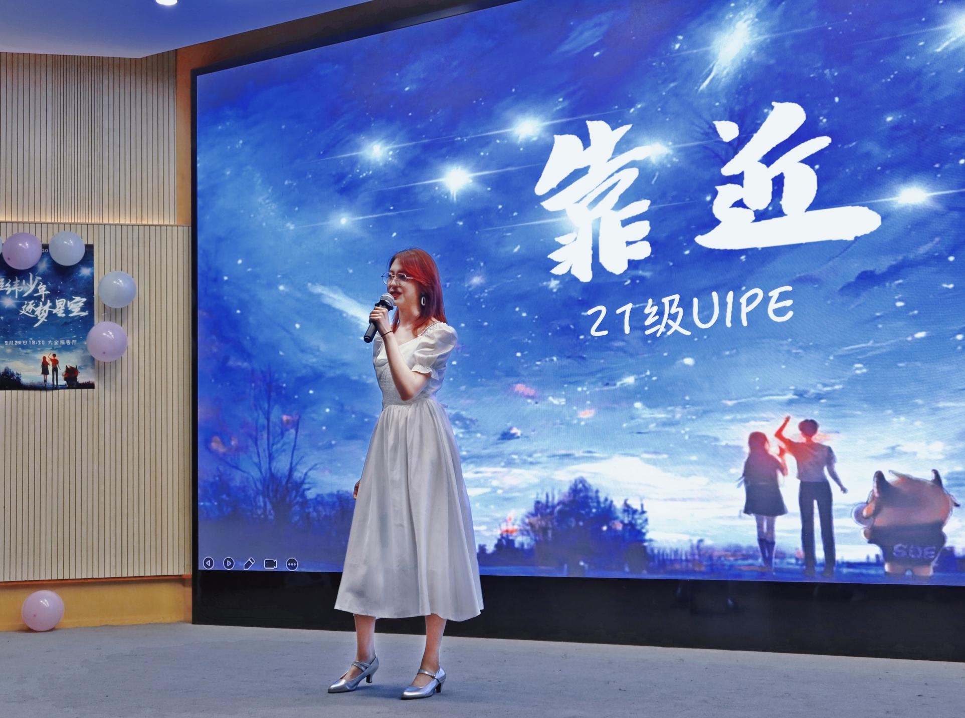 第二个节目是21级UIPE带来的歌曲《靠近》。观众们挥舞着手中的荧光棒,沉醉在优美动听的歌声之中。