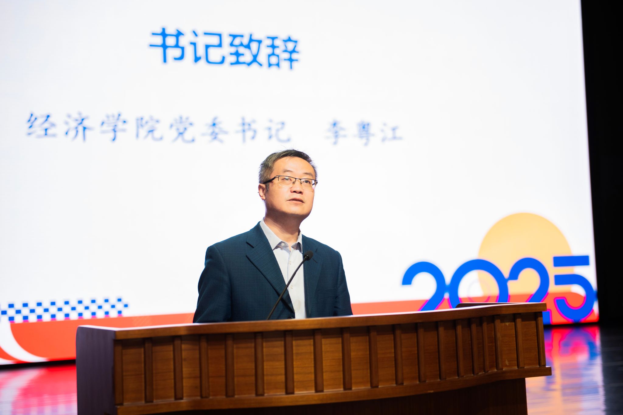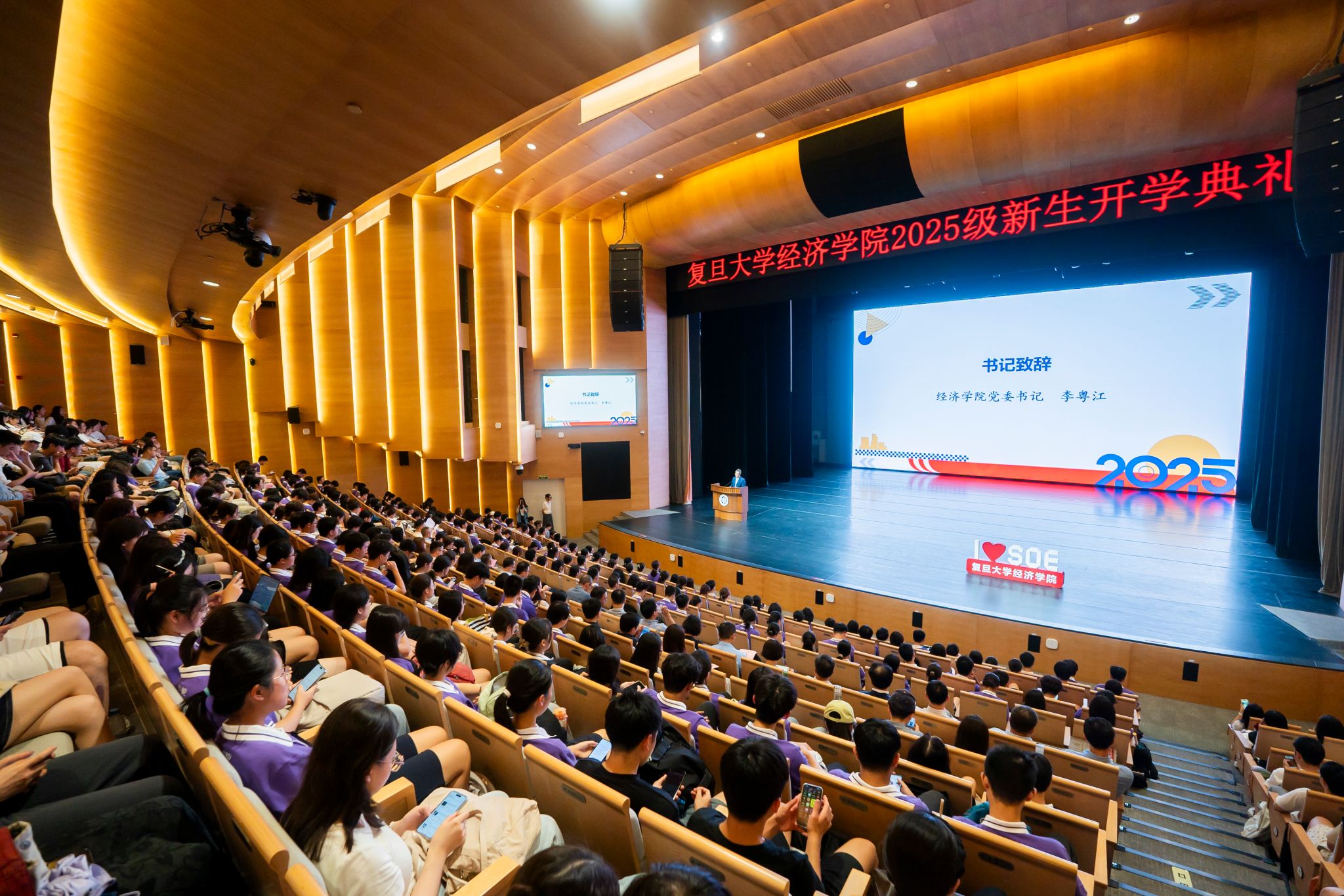 2025年9月16日中午,复旦大学经济学院2025级新生开学典礼在相辉堂北堂隆重举行。经济学院党委书记李粤江老师致辞。