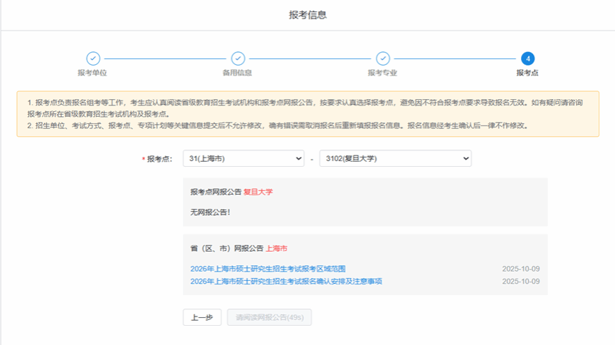 1.所有报考信息填写完毕后,系统会展示“报名信息校对页”,重点核对“招生单位(复旦大学)、院系(经济学院)、专业、学习方式”四项信息,确认无误后点击“确认报名”;