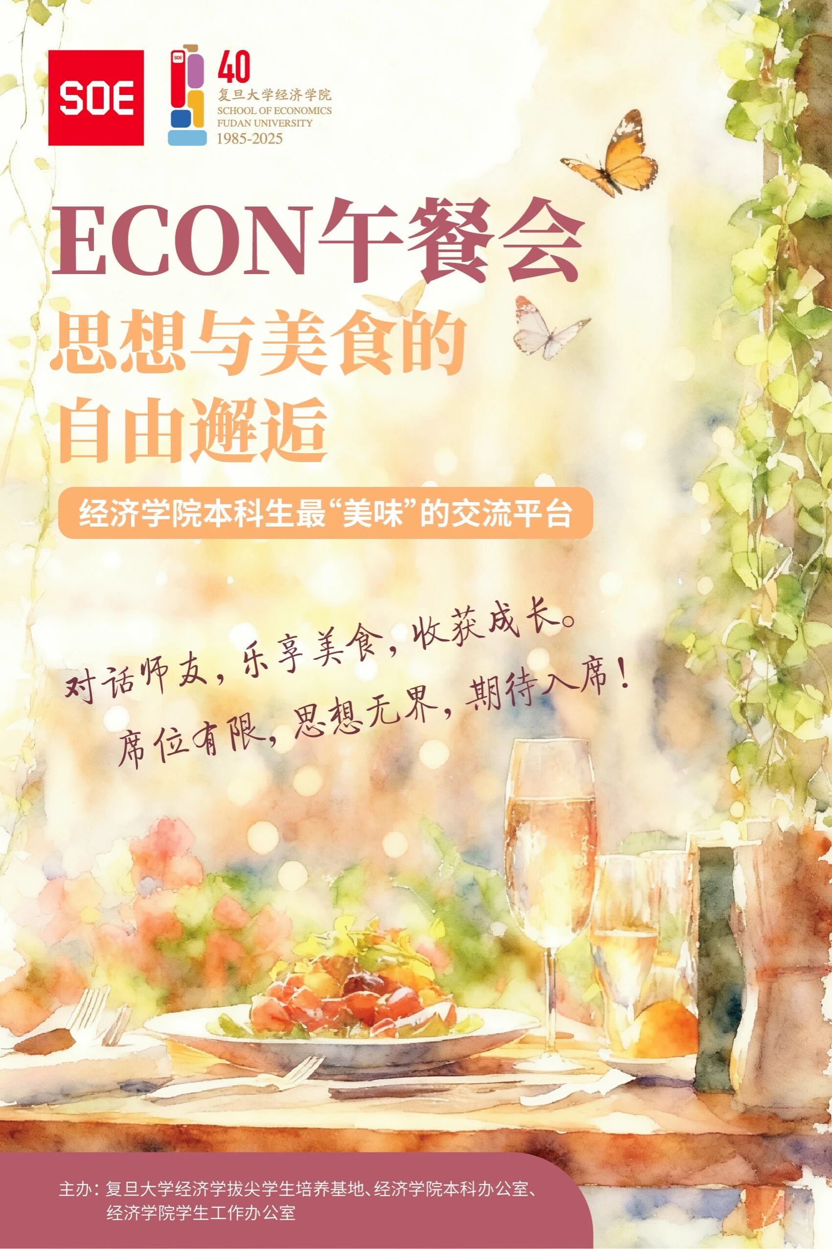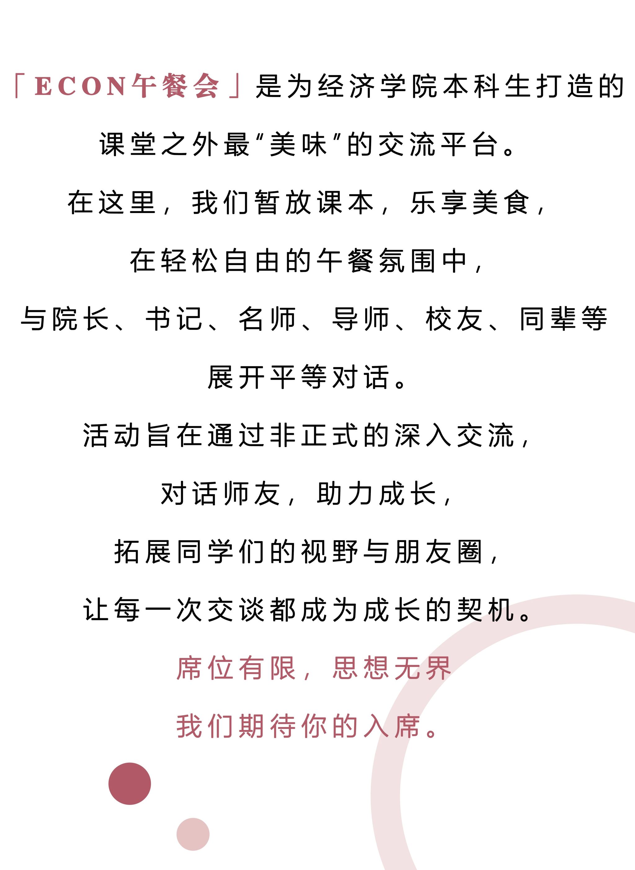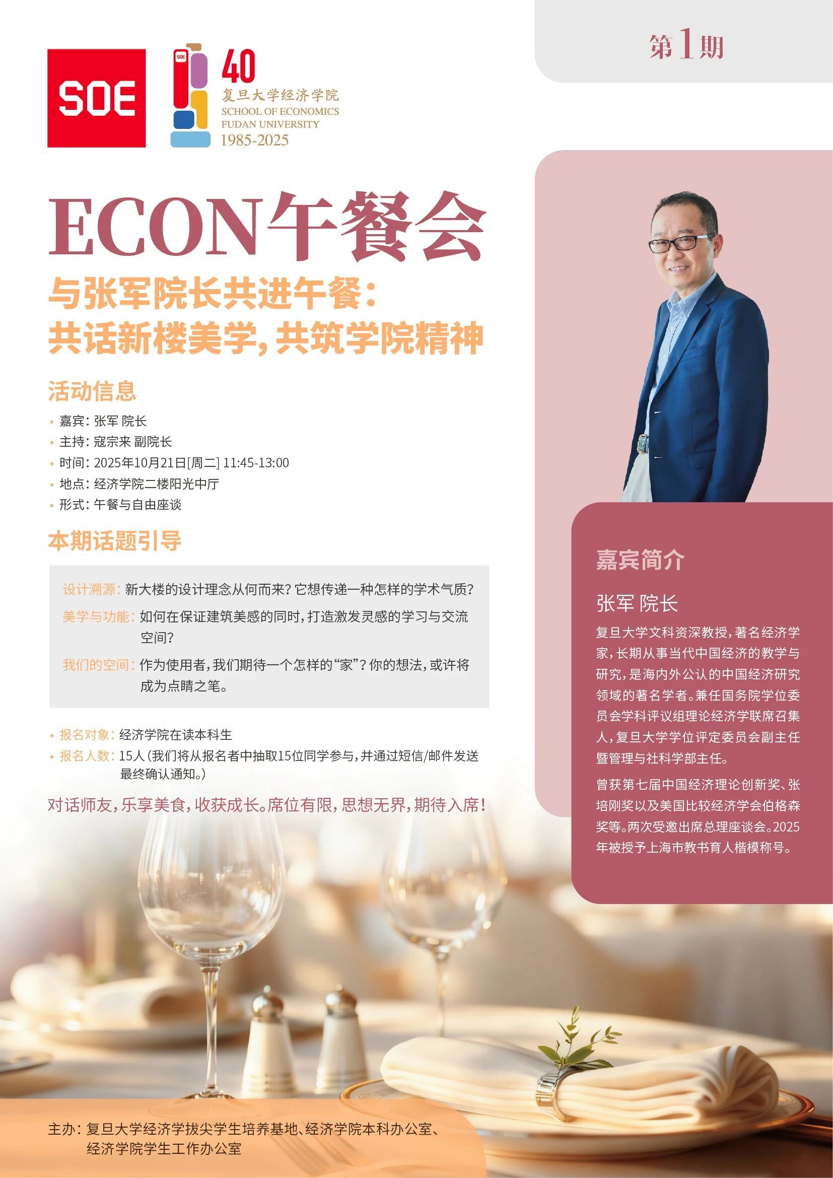 第1期ECON午餐会,我们倍感荣幸地邀请到张军院长,与我们共赴一场别开生面的午餐之约。让我们在美食与畅谈中,聆听院长亲自解读新大楼的设计哲学和美学风格,分享其背后的故事与愿景,共同畅想我们即将入驻的“新家”。