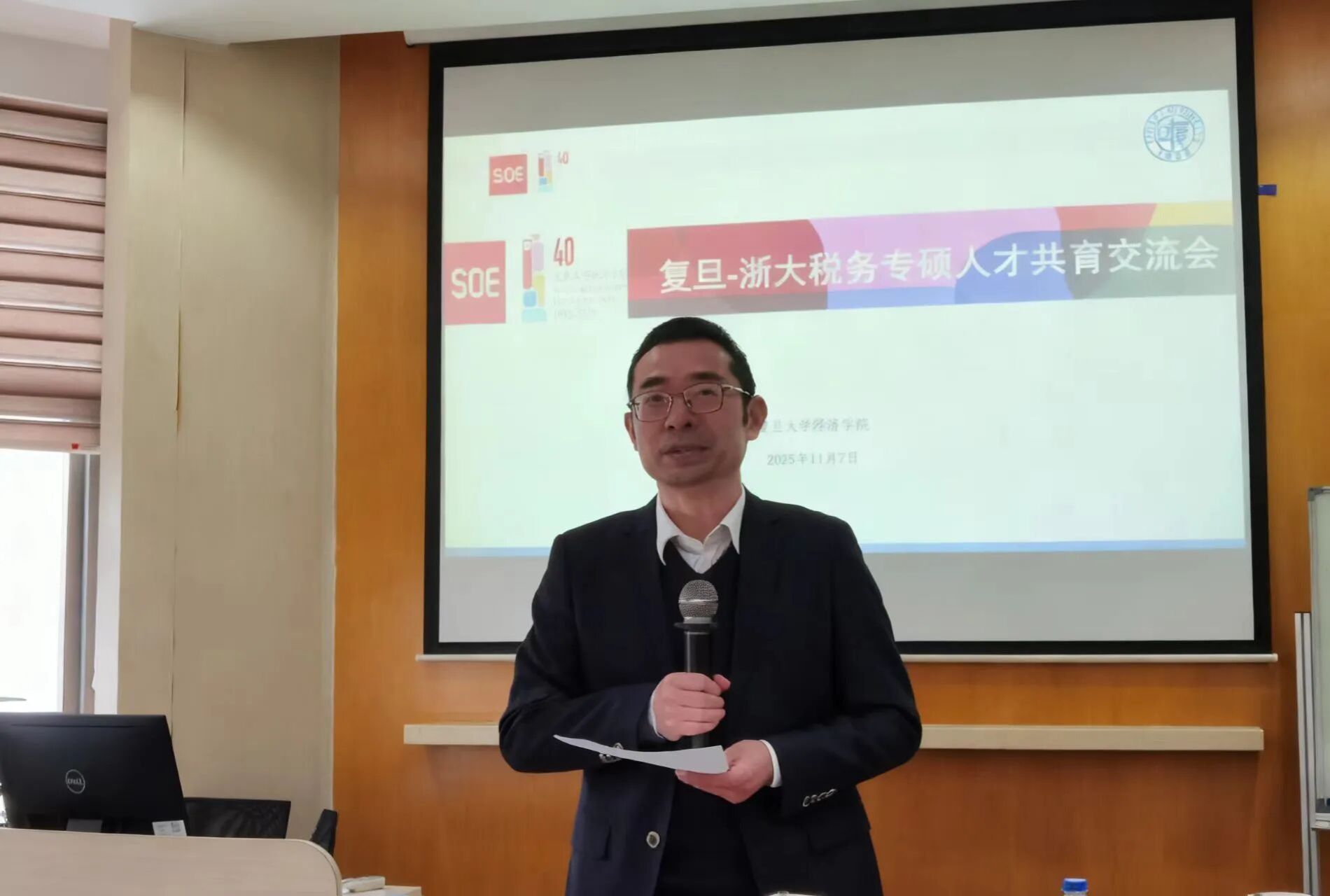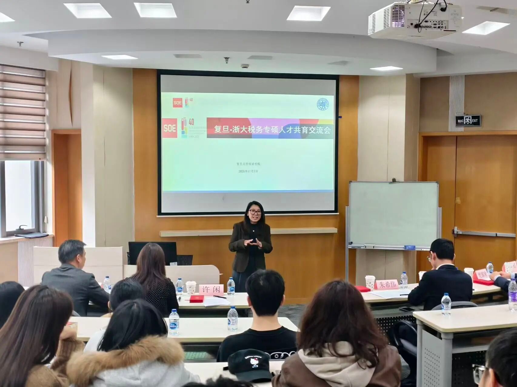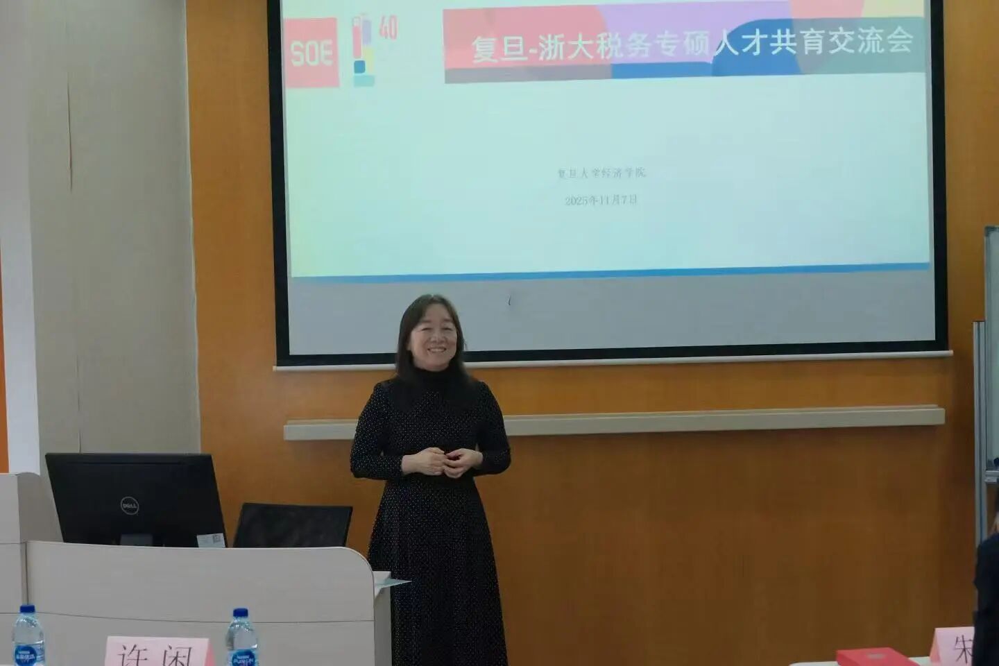 秋光正好,银杏翩跹。2025年11月7日,一场凝聚智慧、联结情谊的校际交流会“复旦-浙大税务专硕人才共育交流会”在复旦大学邯郸校区顺利举行。本次活动旨在深化两校在税务专硕人才培养方面的合作,共同探索新时代税务人才培育新路径。两校经济学院领导、税务专硕项目负责人及师生代表齐聚一堂,通过主题发言、座谈研讨、校园参观、午餐交流等丰富形式,展开了一场深入而有温度的对话。