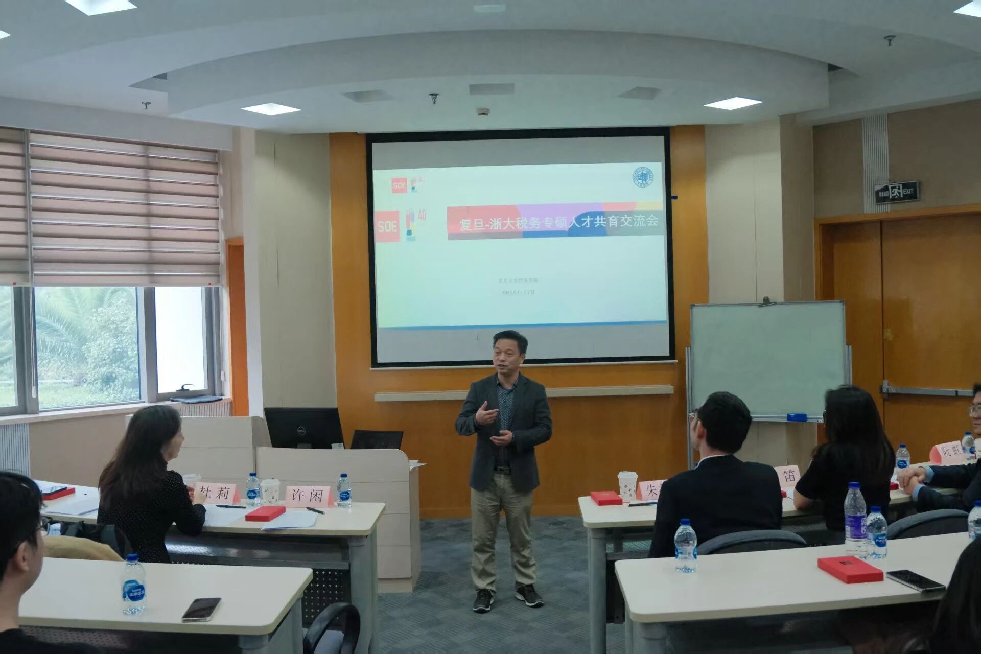浙江大学经济学院税务专硕项目主任樊骥暕副教授在致辞中感谢复旦大学经济学院的热情接待。他简洁明了地介绍了浙大税务专硕的课程设置和就业情况,提出了安排企业参访等项目发展的构想,并表示期待未来能有更多和复旦大学税务专硕项目交流互访的机会。