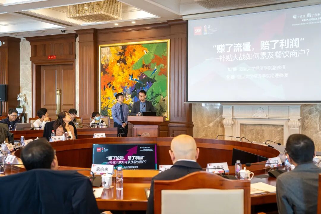 会议由复旦大学经济学院助理教授李婷主持。复旦大学经济学院副教授胡博、助理教授李睿代表课题组详细介绍了此项研究。数据分析结果显示,相对于常态化补贴,大额补贴通过降低实际支付价格刺激了消费者外卖消费意愿,带动外卖订单量快速增长。然而,商户侧普遍呈现“增量不增收”的状态。7月以来竞争加剧期,商户每日“外卖加堂食”总订单量平均增长7%,但商户每日实收金额平均下降约4%。在“外卖利润率保持不变”的基准情形下估算,竞争升温期商户外卖加堂食总利润平均下降约1.7%,进入竞争加剧期后,平均降幅扩大至8.9%。上述利润增减因商户而异,若补贴大战下外卖订单利润率进一步下降,则上述商户总利润降幅更大;反之,若外卖订单利润率提高,则可能出现商户利润增长。