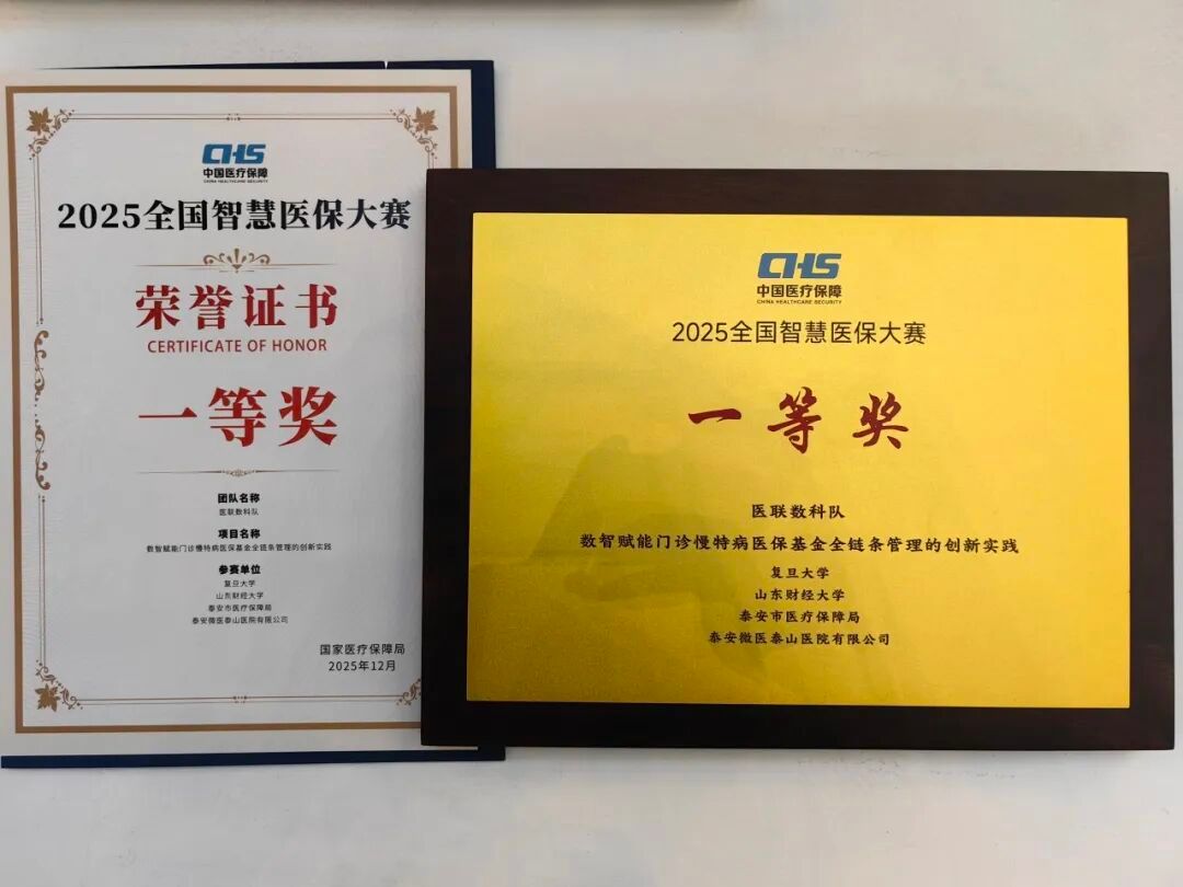 2025年12月8日,2025年全国智慧医保大赛颁奖典礼在上海隆重举行。本届大赛由国家医保局与上海市人民政府联合主办,共吸引了全国802支团队参与角逐。经过激烈竞争与严格评审,由复旦大学经济学院封进教授、王贞副教授领衔,联合泰安市医疗保障局、泰安微医泰山医院、山东财经大学共同组建的“医联数科队”凭借其卓越的创新实践成果,经历初赛、复赛从178个决赛项目中脱颖而出,一举斩获大赛最高奖项——一等奖。
