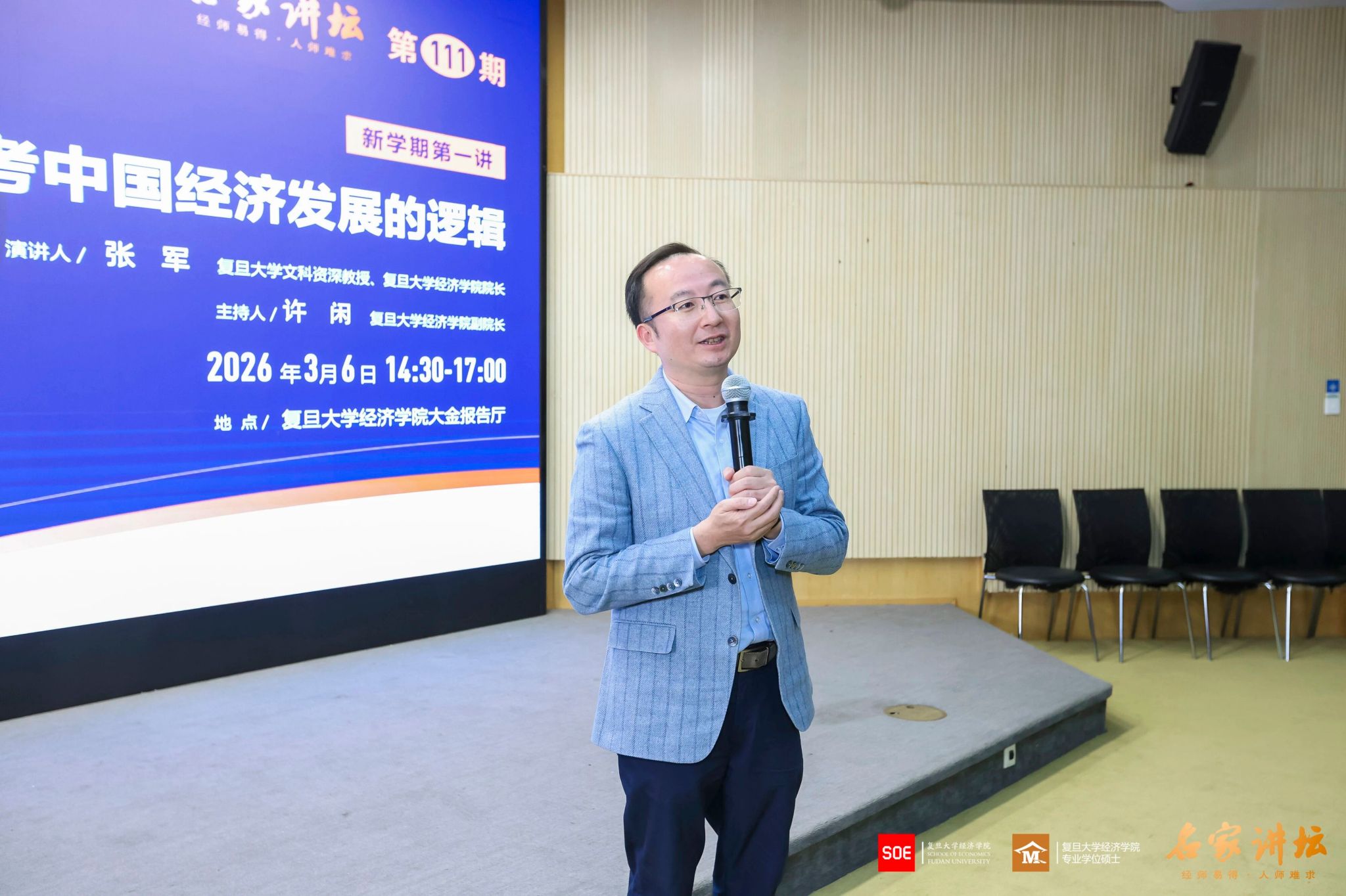 3月6日下午,复旦大学经济学院“名家讲坛”第111期、新学期第一次课程在大金报告厅重磅开讲。复旦大学文科资深教授、经济学院院长张军以“重新思考中国经济发展的逻辑”为主题,面向经济学院专业硕士研究生,带来了一堂丰富精彩的课程。