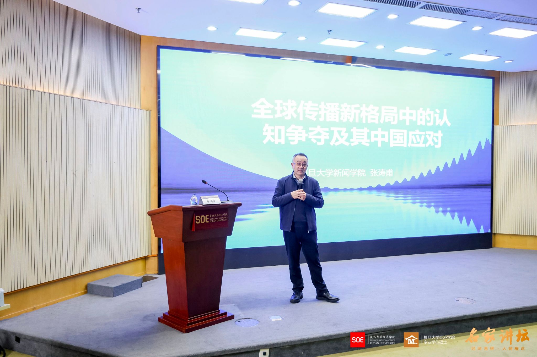 2026年3月13日,复旦大学经济学院“名家讲坛”第112期、本学期第二次课程在大金报告厅开讲。特邀复旦大学新闻学院张涛甫教授作《全球传播新格局中的认知争夺及其中国应对》专题讲座。
