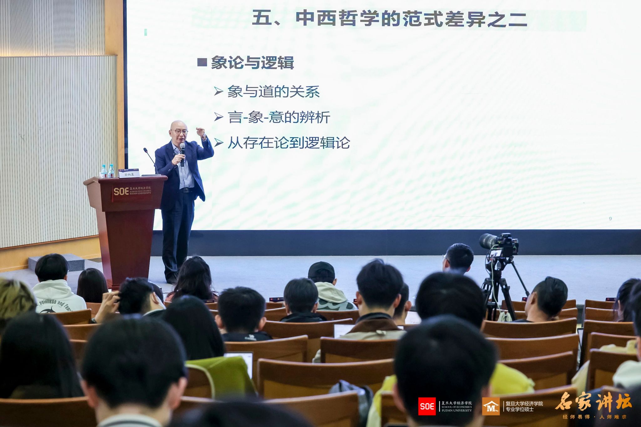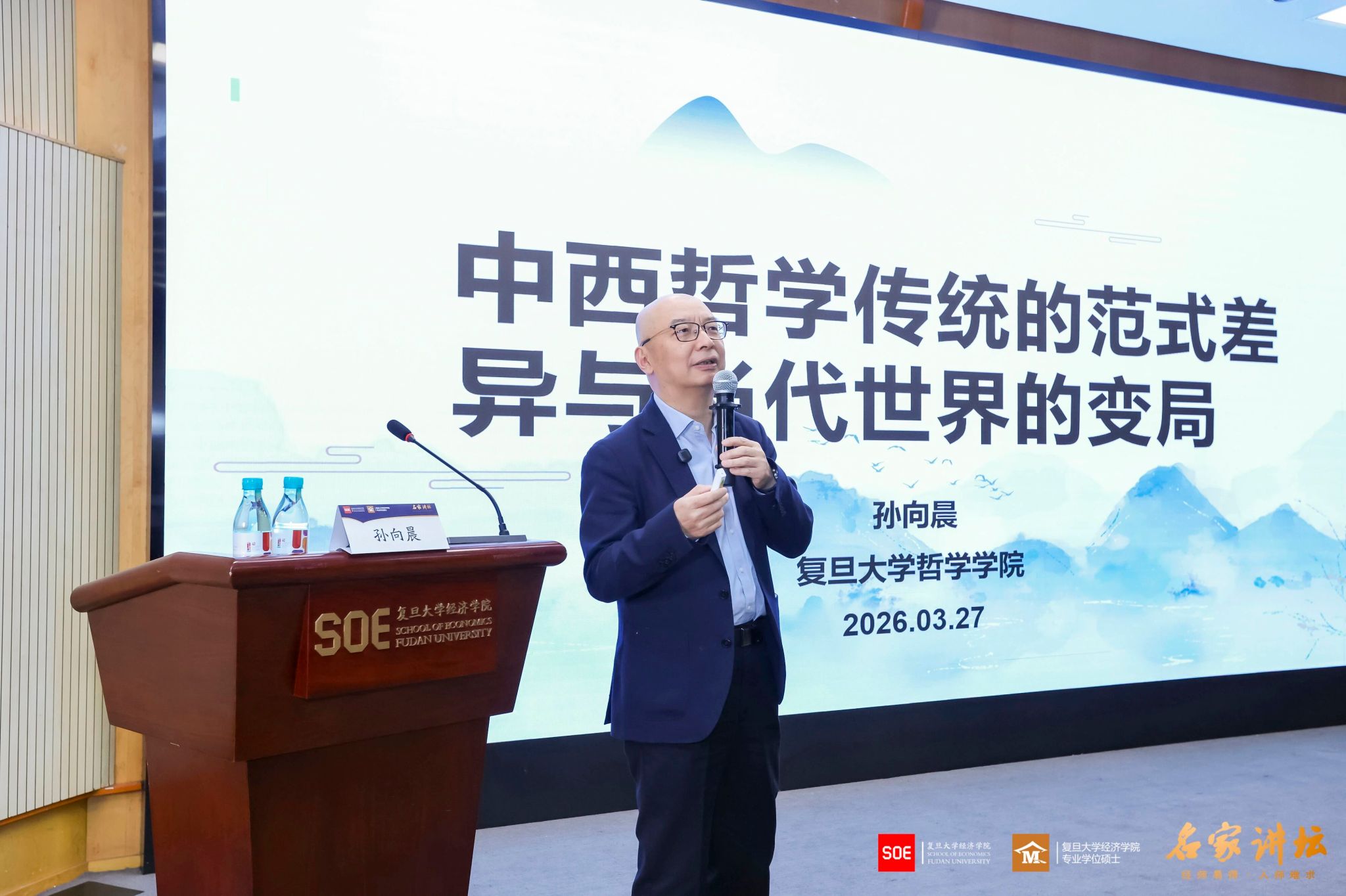 2026年3月27日,复旦大学经济学院“名家讲坛”第114期、本学期第四次课程在大金报告厅开讲。特邀复旦大学学术委员会副主任、人文学部主任孙向晨教授开展专题分享,以“中西哲学传统的范式差异与当代世界的变局”为主题,解析中西文明核心分野,挖掘传统哲学智慧的当代启示。复旦大学经济学院研究生学术主任王贞副教授主持本场讲座,多位经济学院专业学位硕士行业导师及校友也到场聆听,报告厅内气氛热烈。