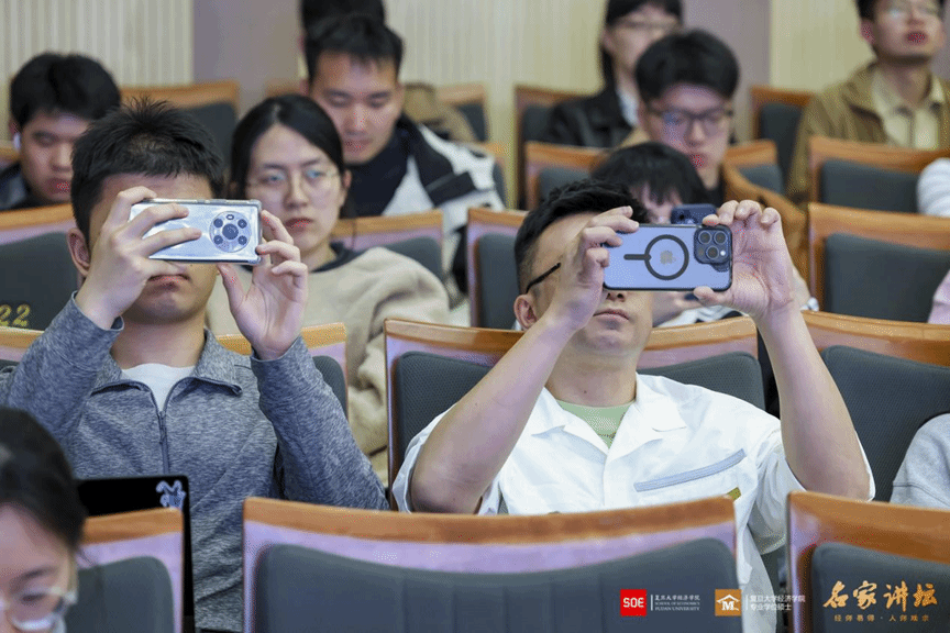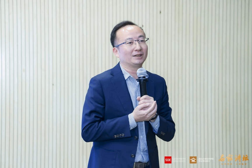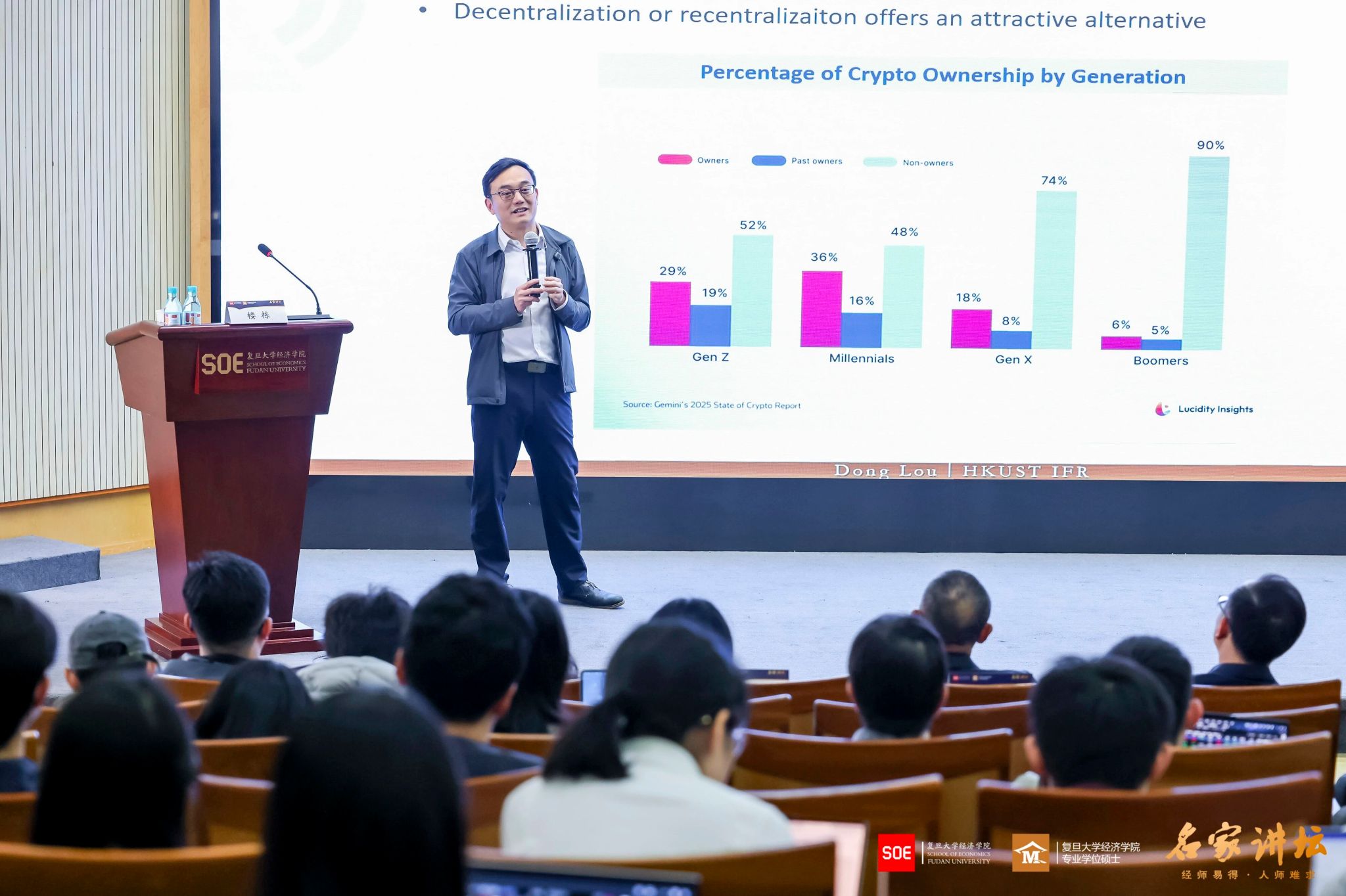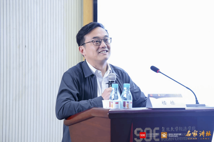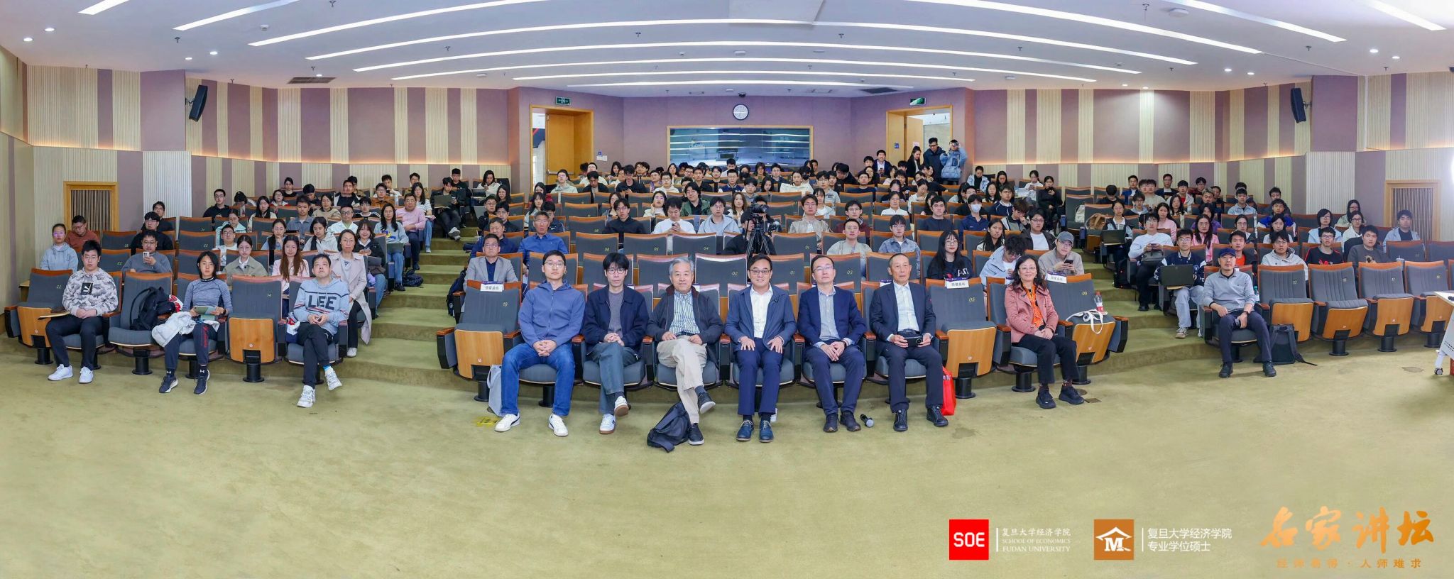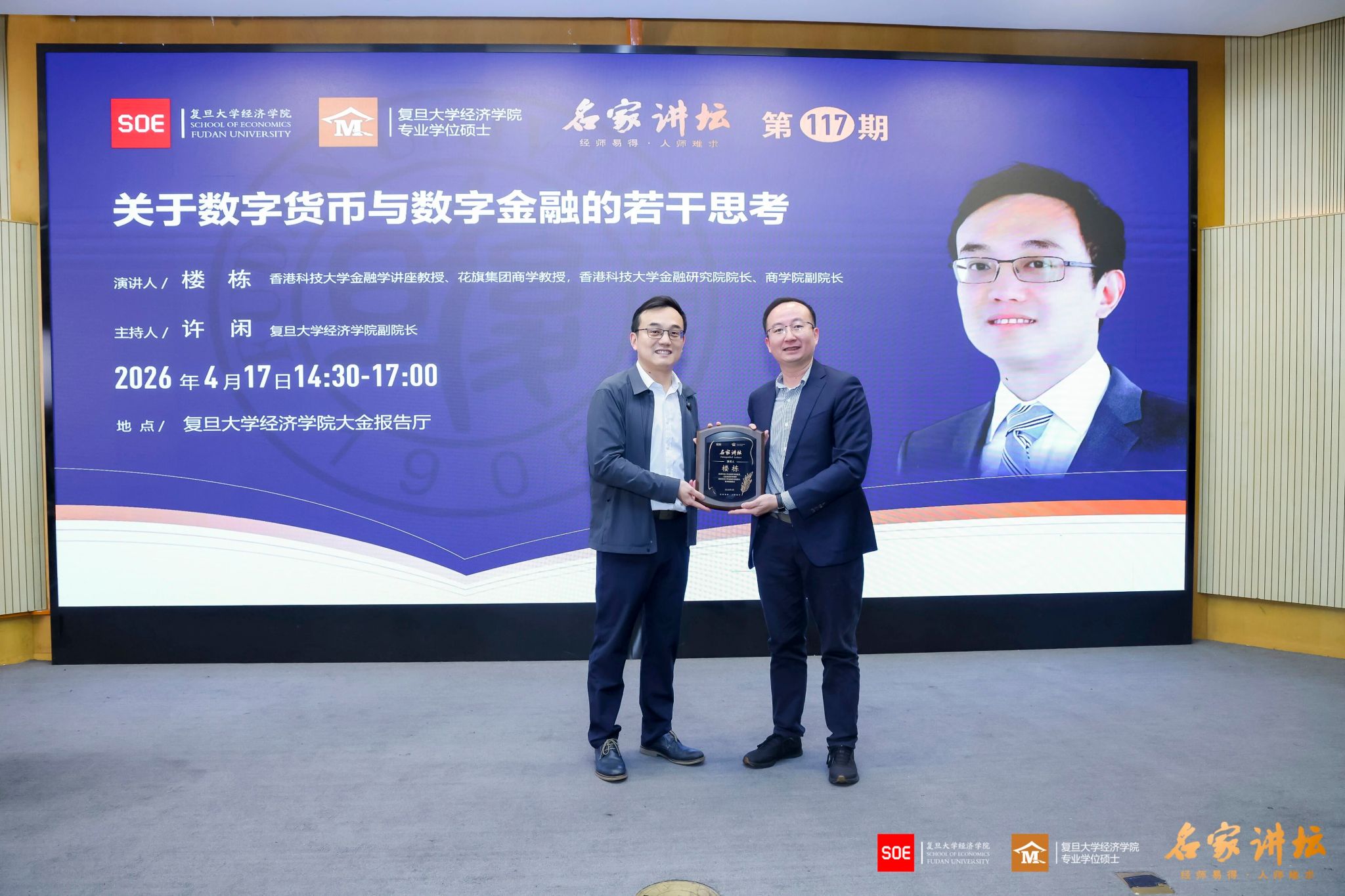 2026年4月17日,复旦大学经济学院“名家讲坛”第117期、本学期第七次课程在大金报告厅开讲。特邀香港科技大学金融学讲座教授、花旗集团商学教授、香港科技大学金融研究院院长、商学院副院长楼栋教授开展专题分享,以“关于数字货币与数字金融的若干思考”为主题。复旦大学经济学院副院长许闲教授主持本场讲座,多位经济学院专业学位硕士行业导师及校友也到场聆听,报告厅内气氛热烈。