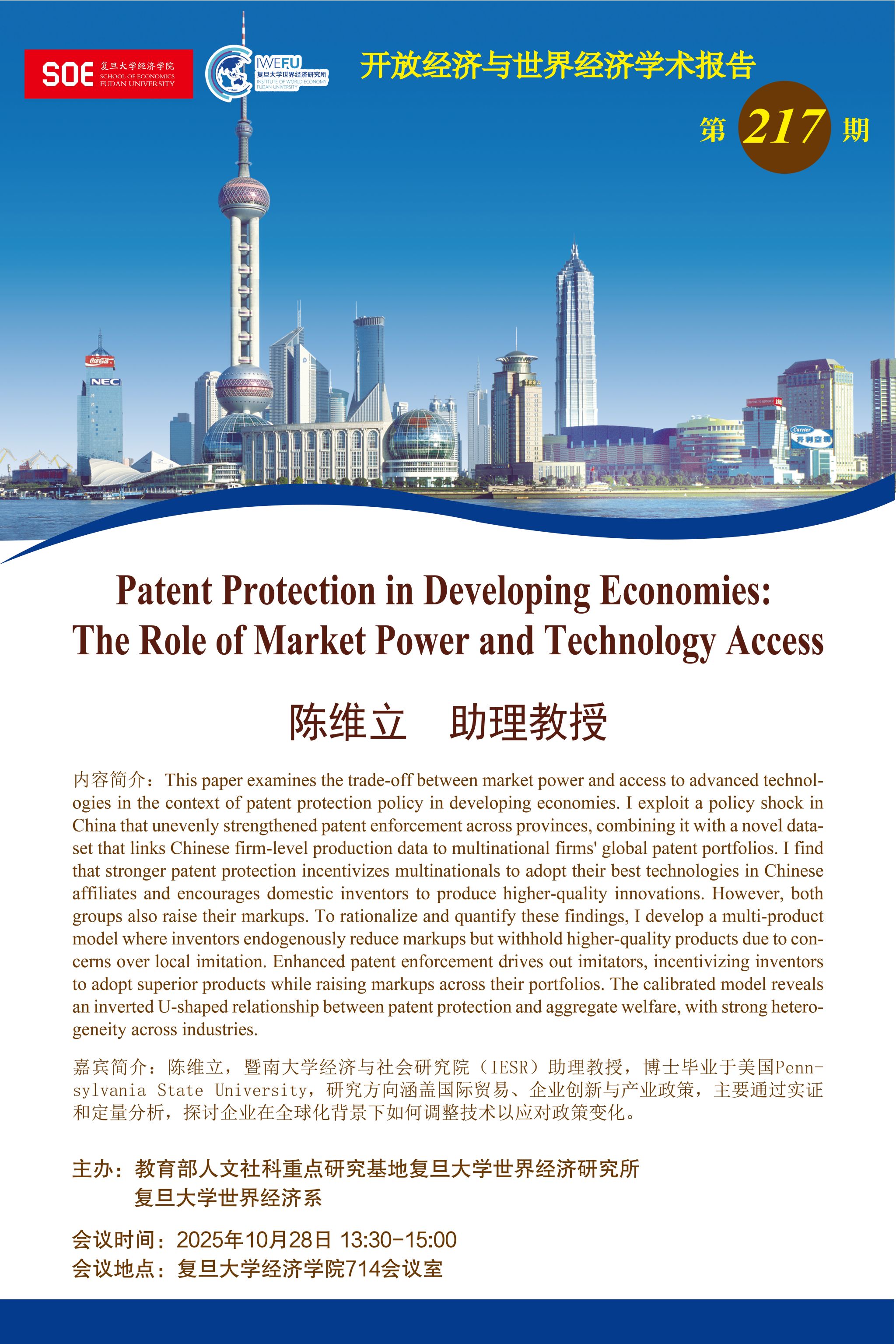 复旦大学世界经济研究所开放经济与世界经济学术报告第217期:Patent Protection in Developing Economies: The Role of Market Power and Technology Access