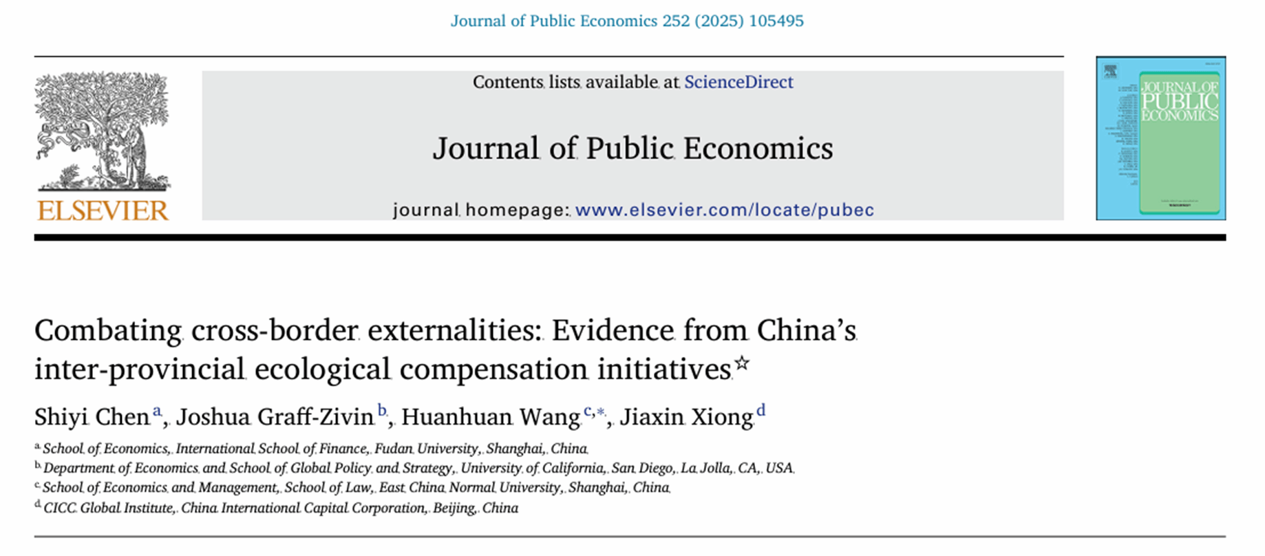 近日,复旦大学经济学院陈诗一教授的合作论文Combating cross-border externalities: Evidence from China's inter-provincial ecological compensation initiatives 在公共经济学领域顶尖期刊Journal of Public Economics正式发表。
