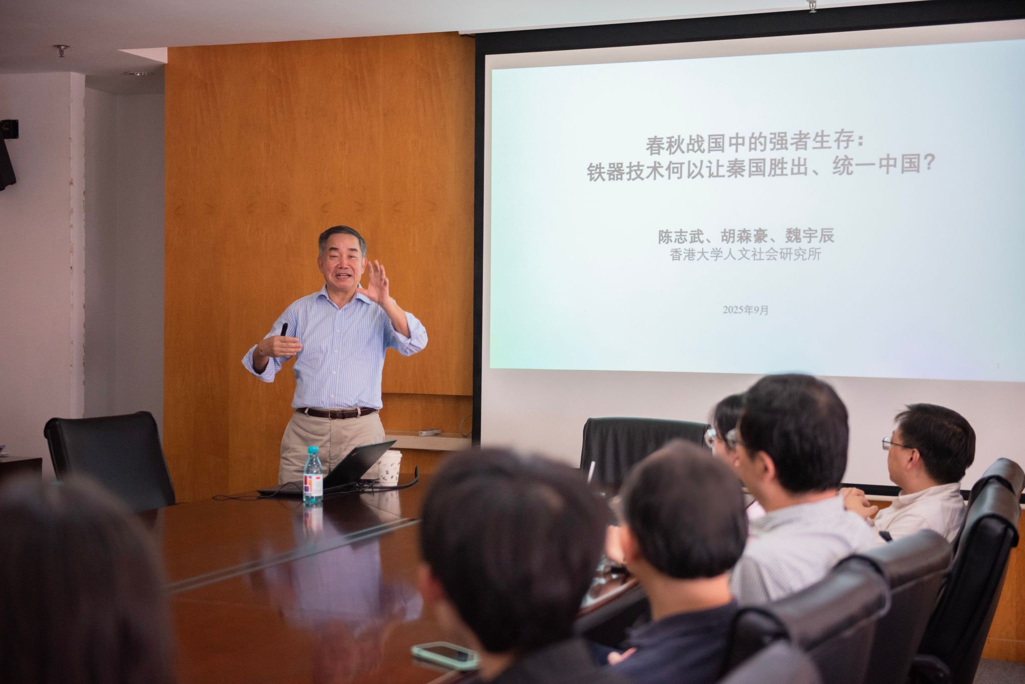 2025年9月12日,复旦经济论坛第430期讲座活动在复旦大学经济学院805会议室顺利召开。香港大学人文社会研究所所长、香港大学经管学院金融学讲座教授、郑氏讲席教授陈志武先生应邀进行学术讲座,报告的主题为“春秋战国中的强者生存:铁器技术何以让秦国胜出、统一中国”。复旦大学经济学院王永钦教授主持此次活动,本校和外校众多中青年学者参加本次论坛并与陈教授围绕讲座内容进行深入的讨论。