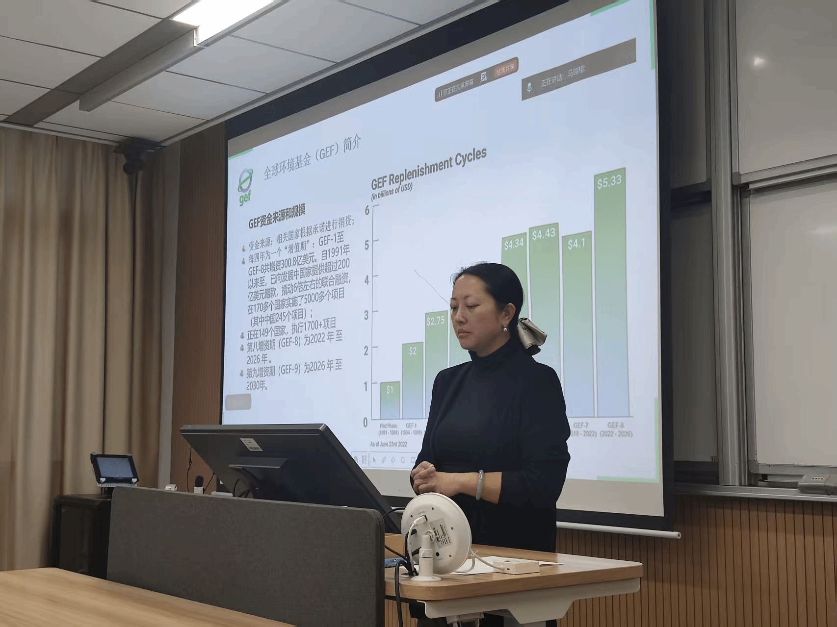 随后,冷老师重点讲解了全球环境基金(GEF)的运作机制。作为由186个国家和地区共同参与的国际多边资金机制,GEF致力于通过赠款方式支持发展中国家开展具有全球效益的环境保护项目。其业务范围覆盖气候变化、生物多样性、化学品和废弃物、国际水域及土地退化等五大领域。资金来源于各参与国按承诺捐资,每四年为一增资周期。从GEF-1至GEF-8,累计增资达300.8亿美元,已向发展中国家提供超200亿美元赠款,并撬动了约6倍的联合融资,在170余个国家落地实施项目超过5000个。