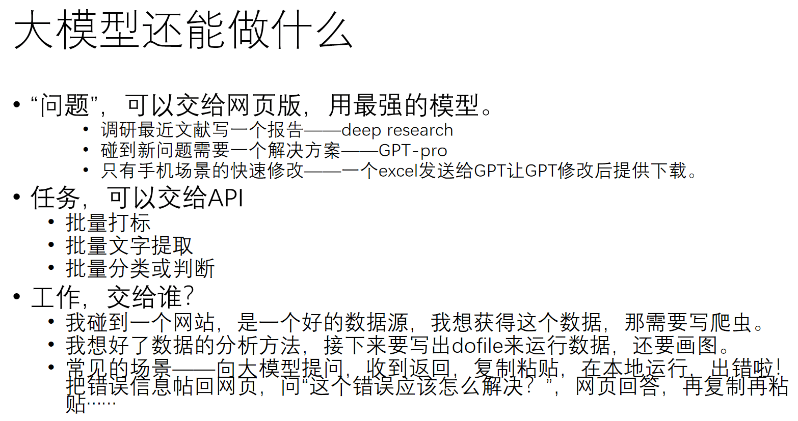 陈老师从大模型的运行原理、使用大模型的原生能力、给大模型增加知识,以及智能体的构建四方面系统地介绍了大模型在学术研究和商业实践中的应用。