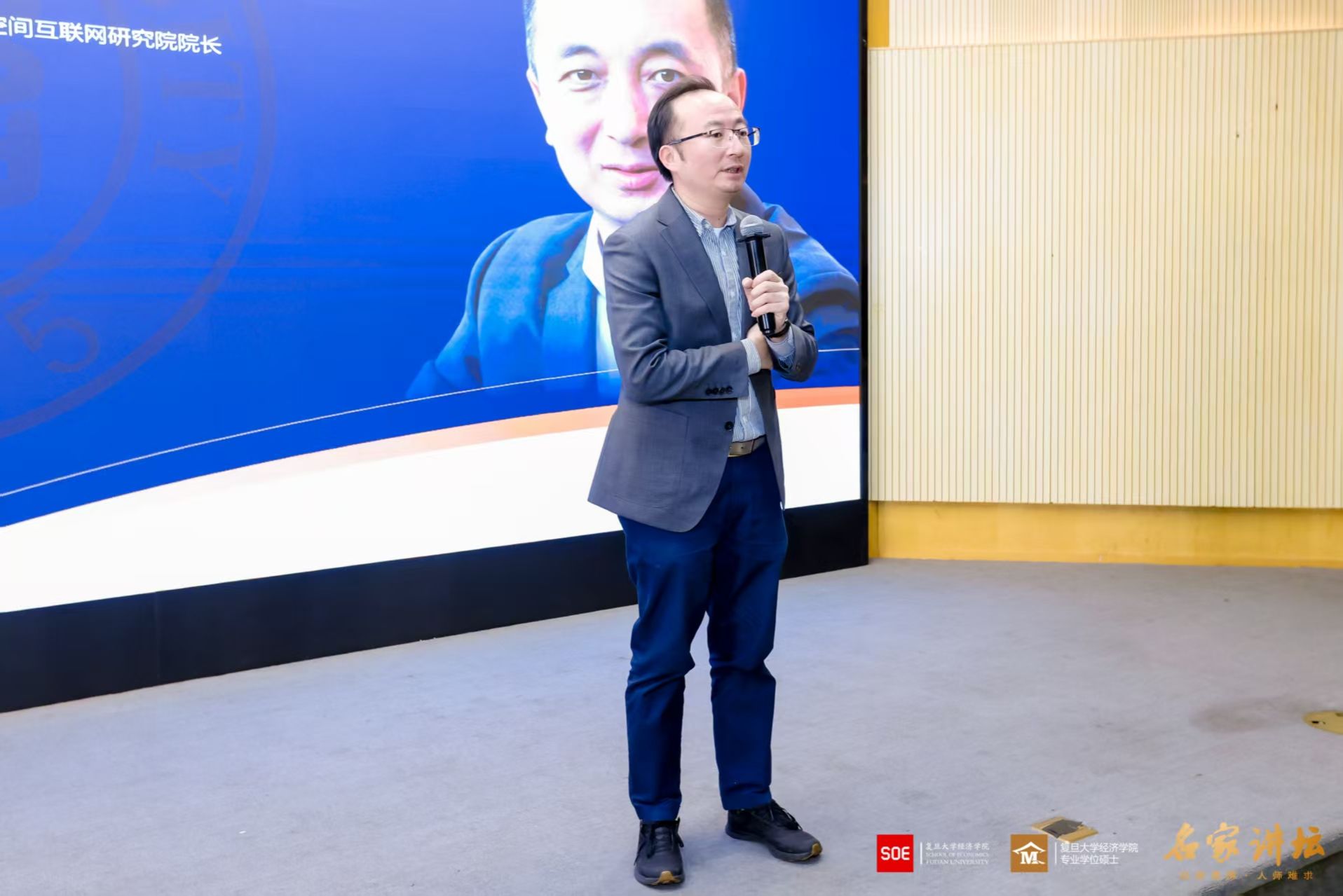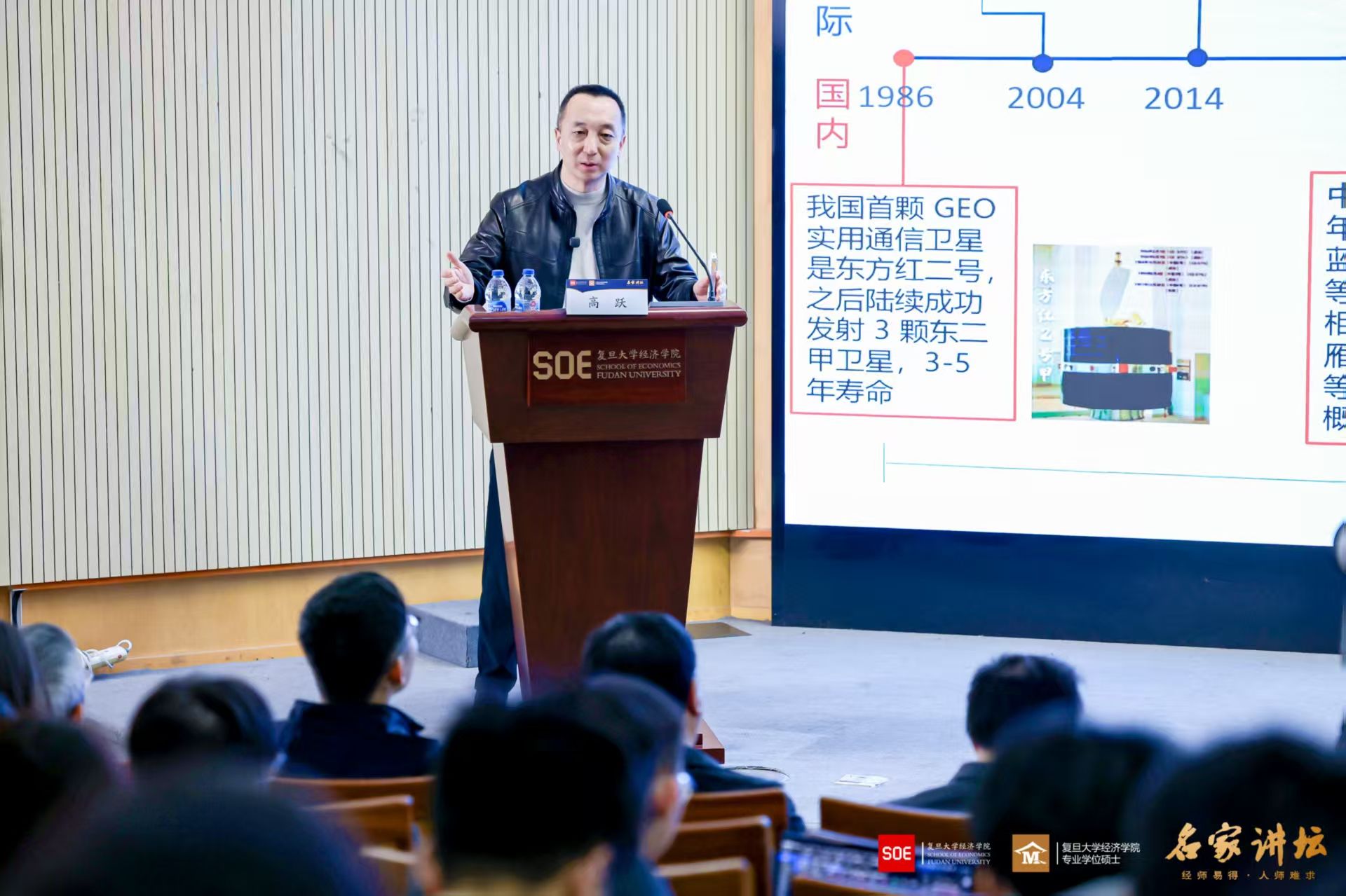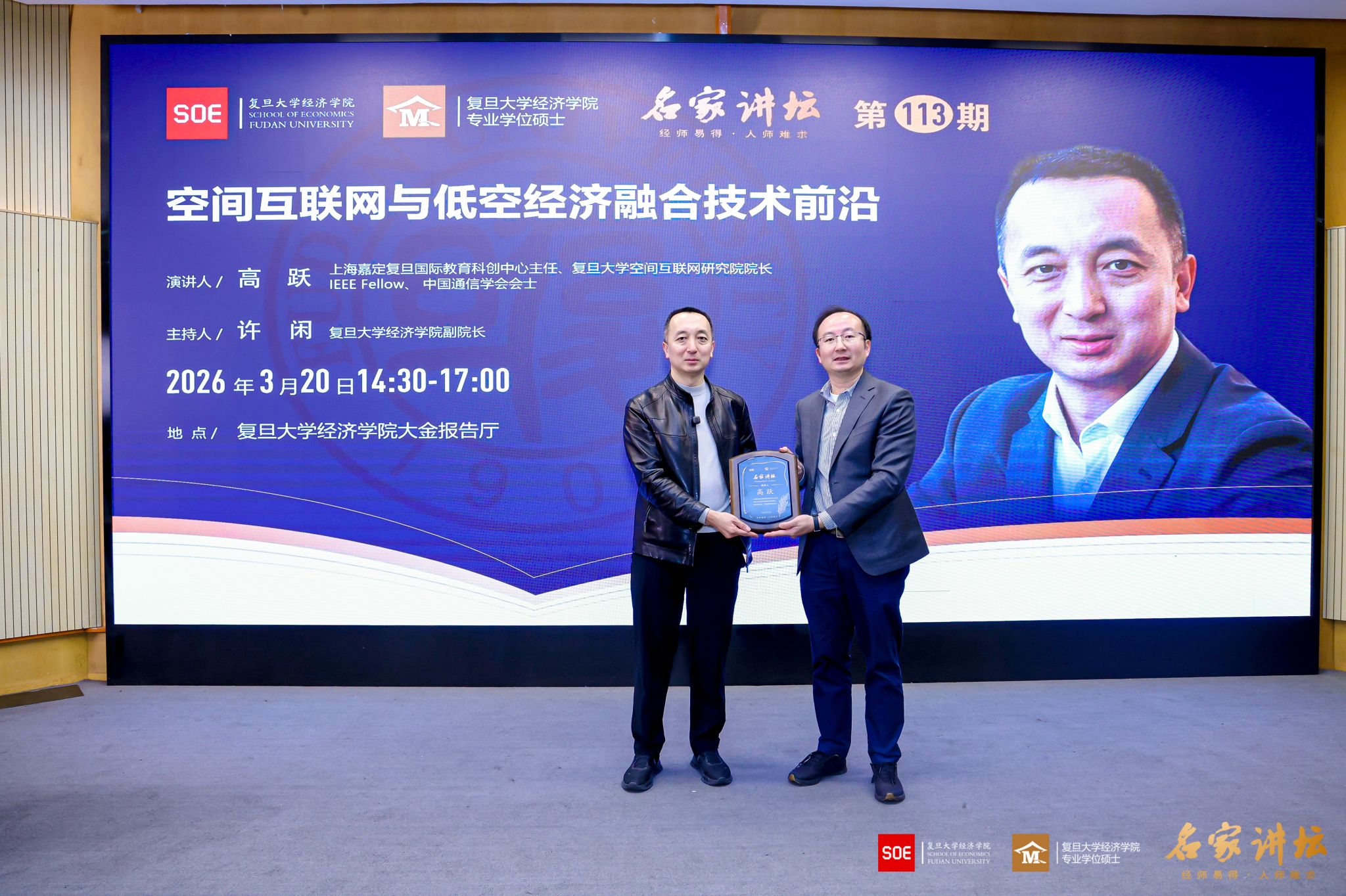 2026年3月20日,复旦大学经济学院“名家讲坛”第113期、本学期第三次课程在大金报告厅举行。复旦大学空间互联网研究院院长高跃教授应邀作题为“空间互联网与低空经济融合技术前沿”的专题讲座,复旦大学经济学院副院长许闲教授主持本场讲座,多位经济学院专业学位硕士行业导师及校友也到场聆听,现场气氛热烈。