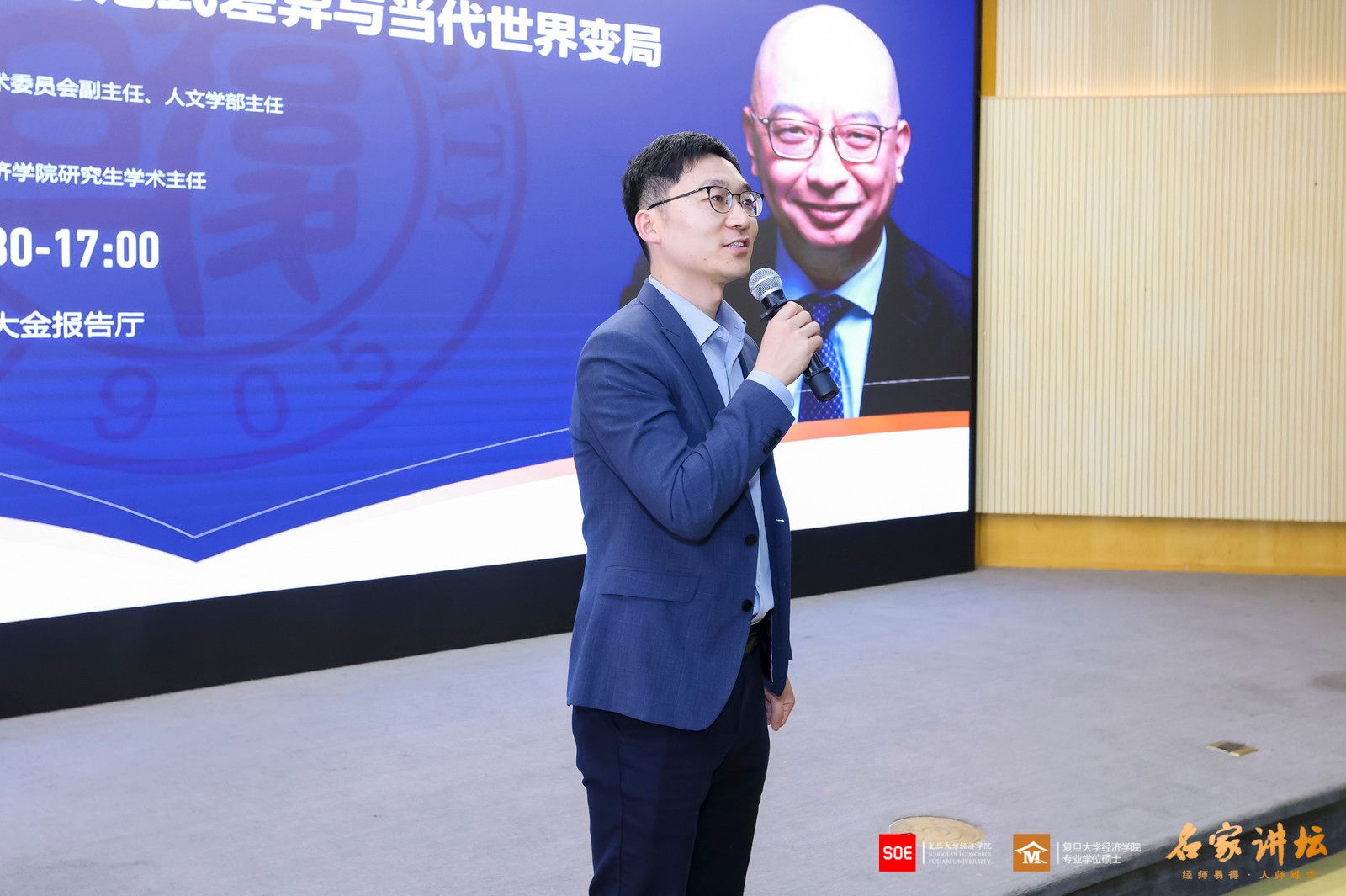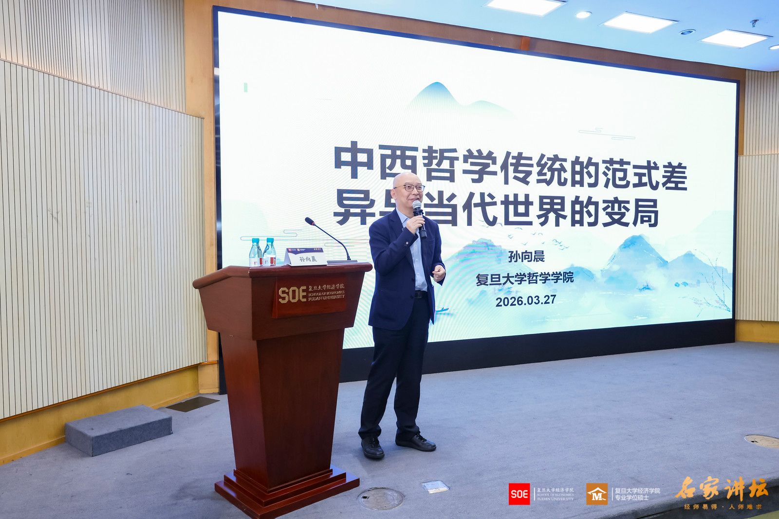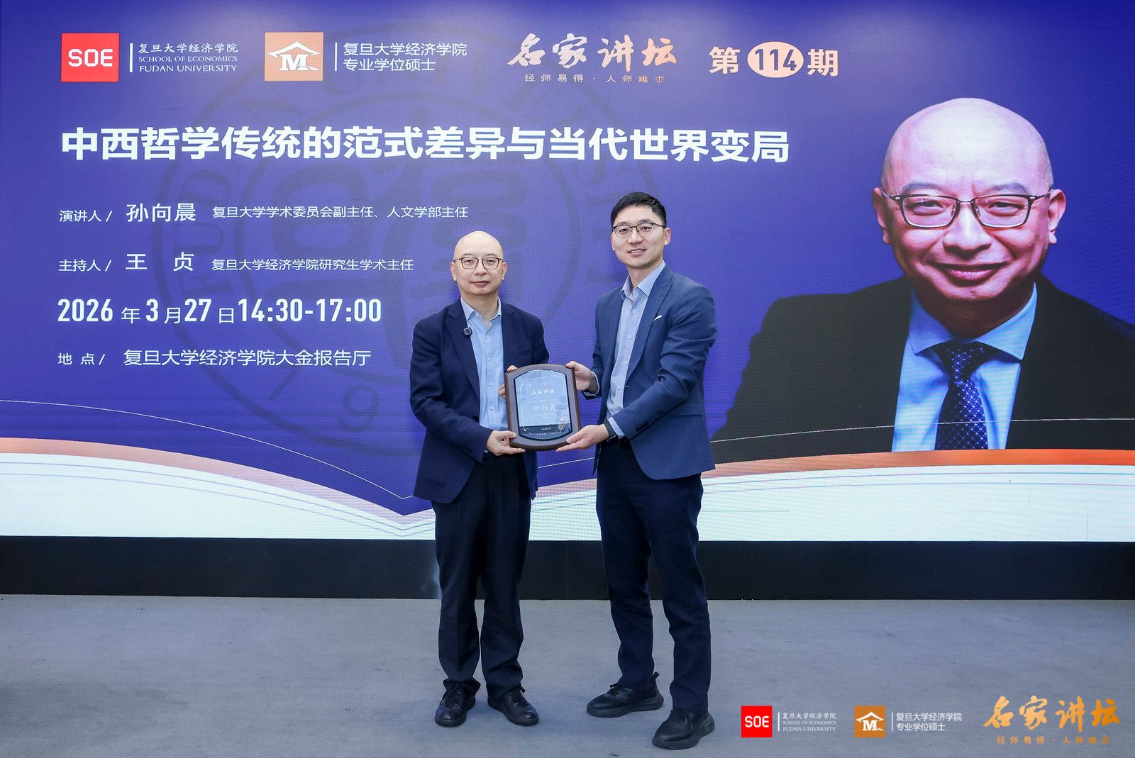 2026年3月27日,复旦大学经济学院“名家讲坛”第114期、本学期第四次课程在大金报告厅开讲。特邀复旦大学学术委员会副主任、人文学部主任孙向晨教授开展专题分享,以“中西哲学传统的范式差异与当代世界的变局”为主题,解析中西文明核心分野,挖掘传统哲学智慧的当代启示。复旦大学经济学院研究生学术主任王贞副教授主持本场讲座,多位经济学院专业学位硕士行业导师及校友也到场聆听,报告厅内气氛热烈。
