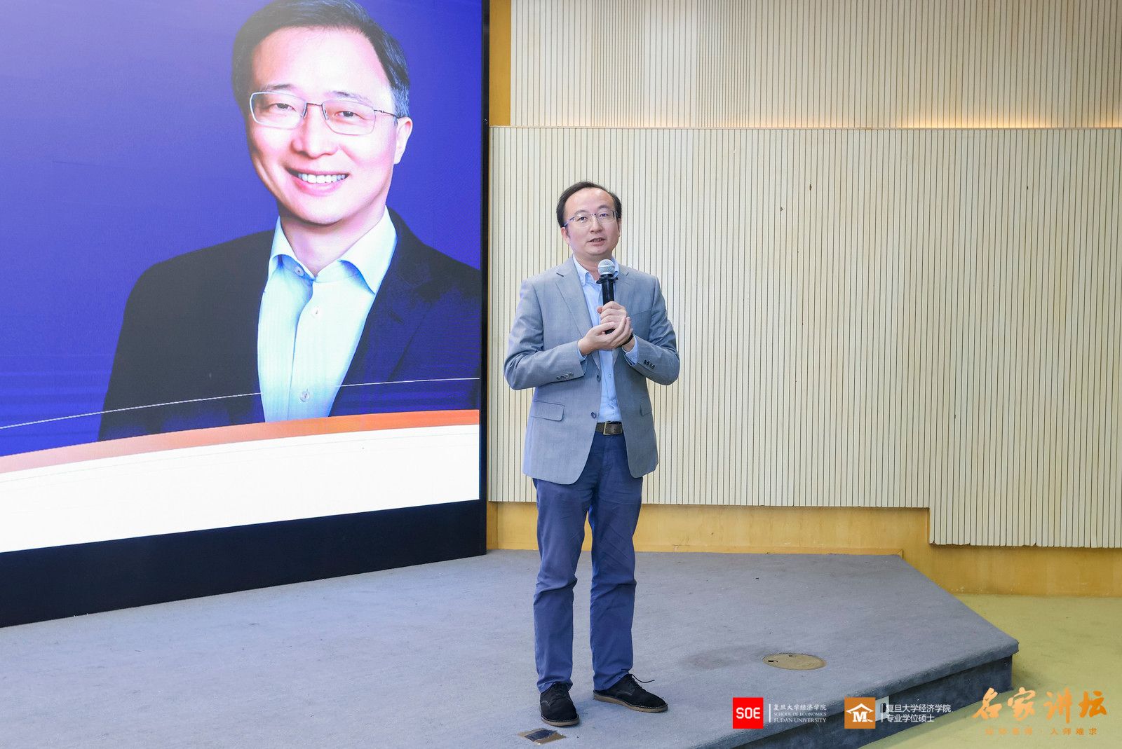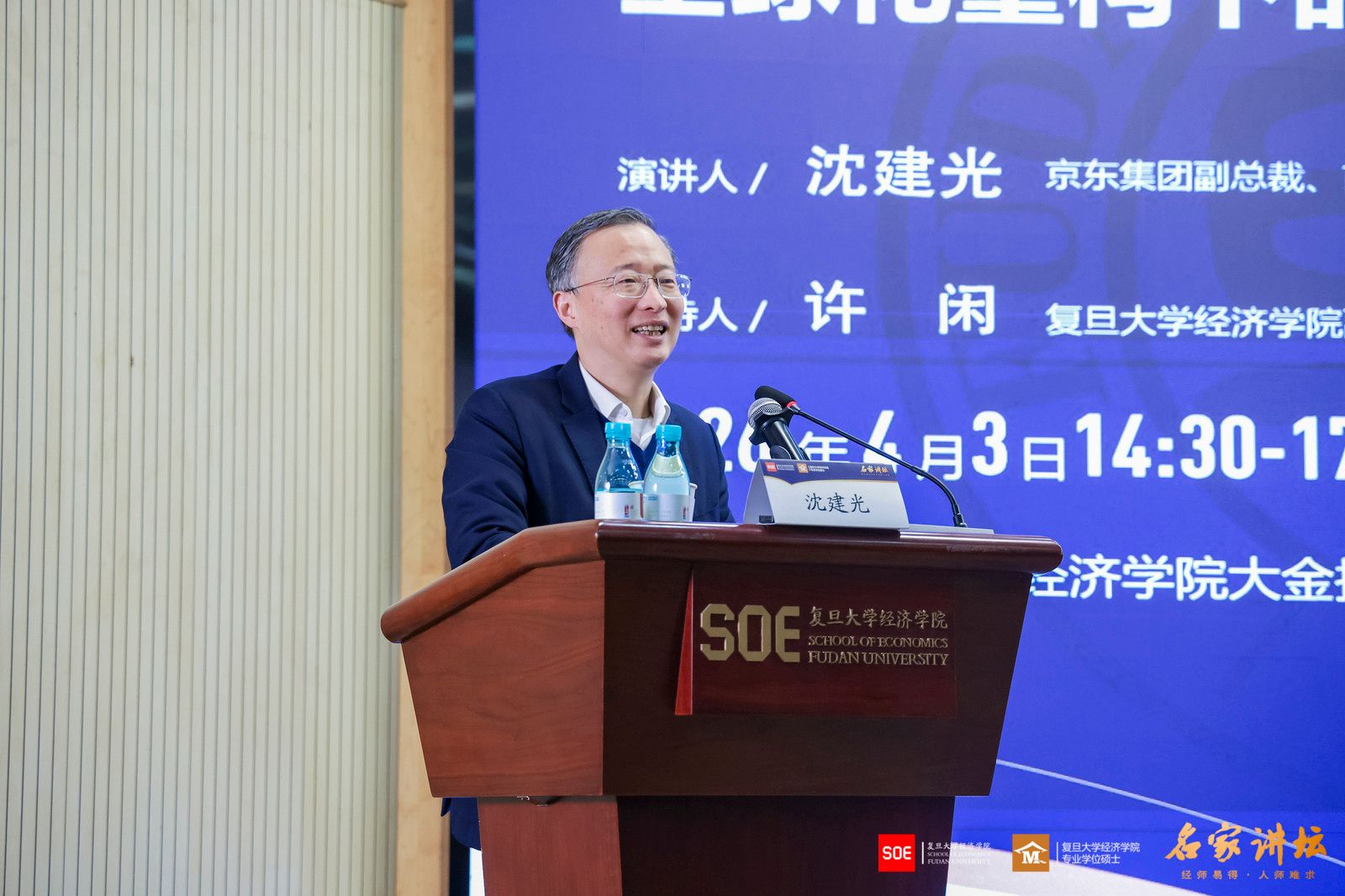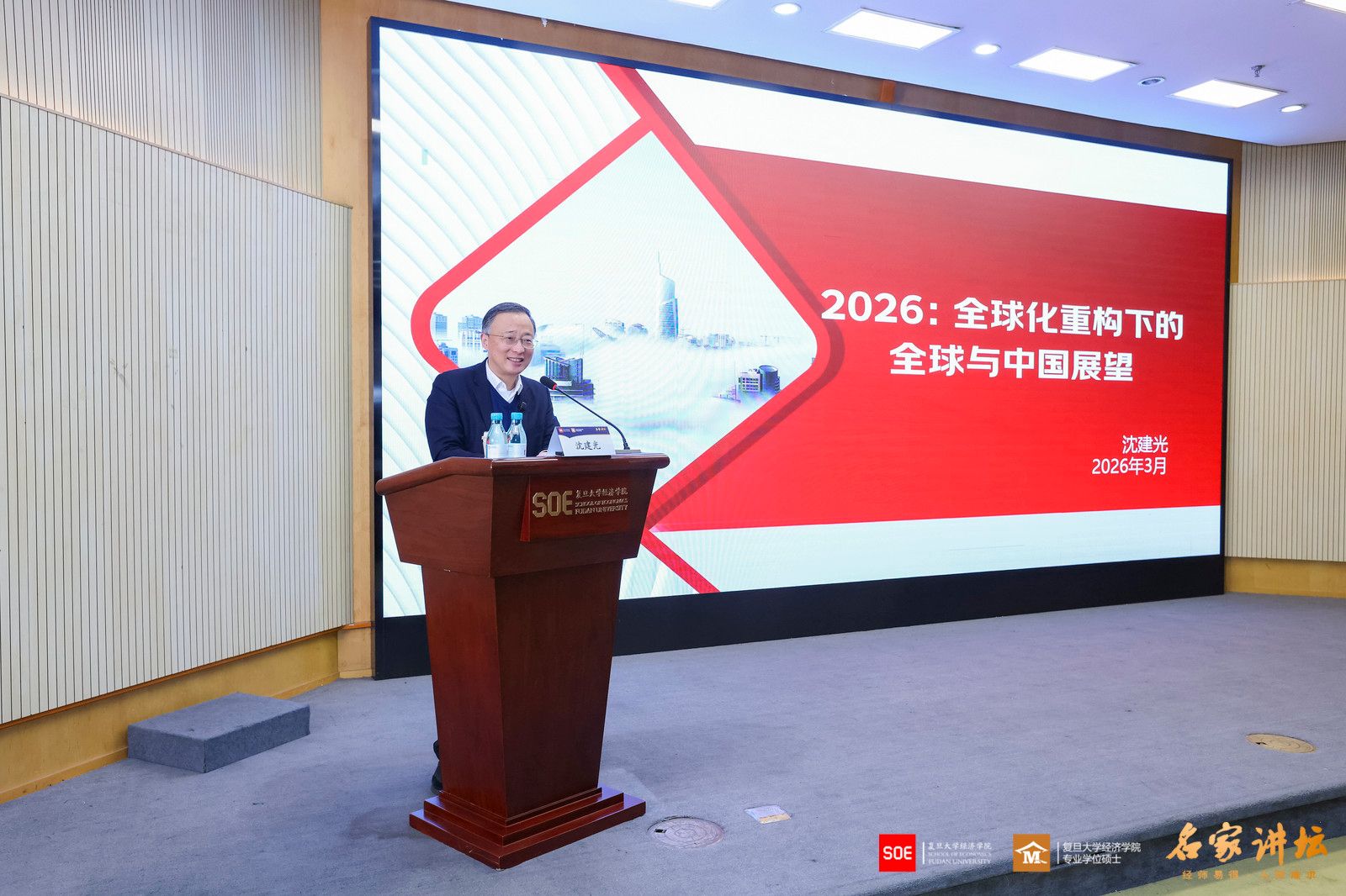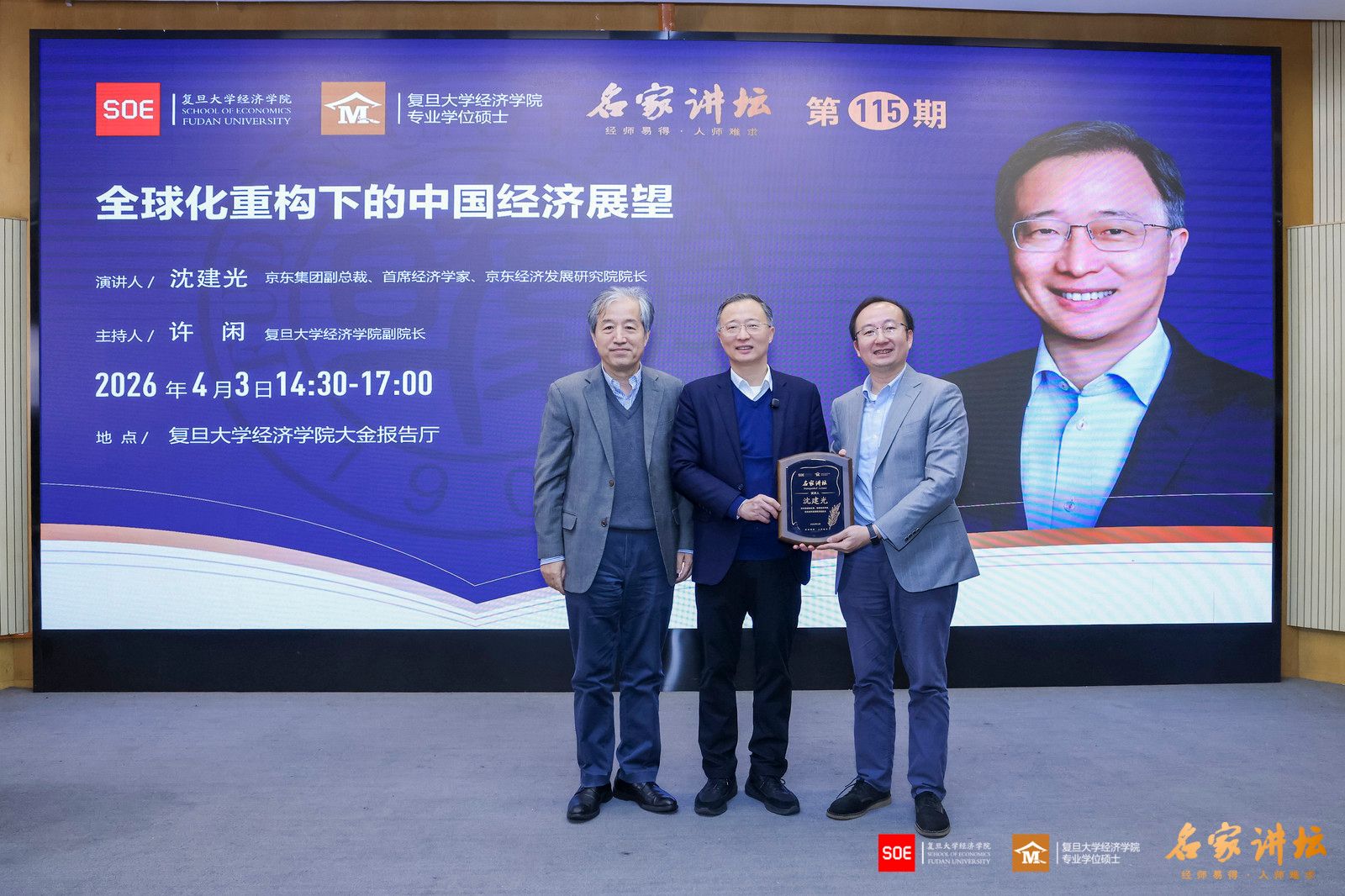 2026年4月3日,复旦大学经济学院“名家讲坛”第115期、本学期第五次课程在大金报告厅开讲。特邀京东集团副总裁、首席经济学家、京东经济发展研究院院长沈建光院长开展专题分享,以“全球化重构下的中国经济展望”为主题。复旦大学经济学院副院长许闲教授主持本场讲座,多位经济学院专业学位硕士行业导师及校友也到场聆听,报告厅内气氛热烈。