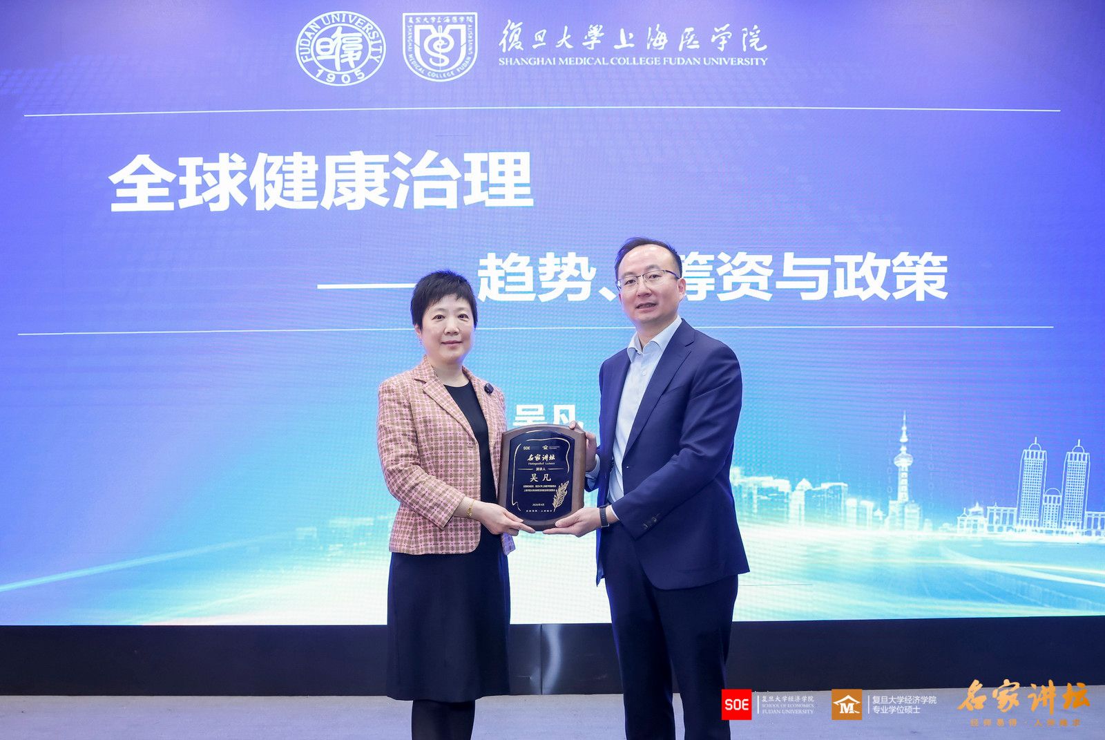2026年4月10日,复旦大学经济学院“名家讲坛”第116期、本学期第六次课程在大金报告厅开讲。特邀复旦大学上海医学院吴凡教授开展专题分享,以“全球健康治理 —— 趋势、筹资与政策”为主题,系统解读全球健康领域的核心变革、关键挑战与未来走向。复旦大学经济学院副院长许闲教授主持本场讲座,报告厅内气氛热烈。