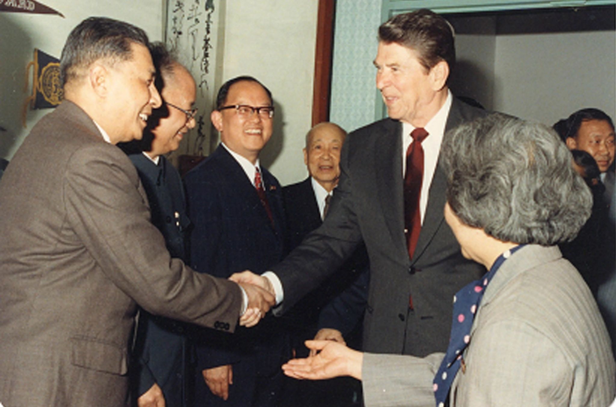 ▲1984年4月30日,美国总统里根访问我校时会见苏步青、谢希德、谭其骧、华中一、蒋学模等教授,右图为经济学系蒋学模教授(左一)与里根总统握手。