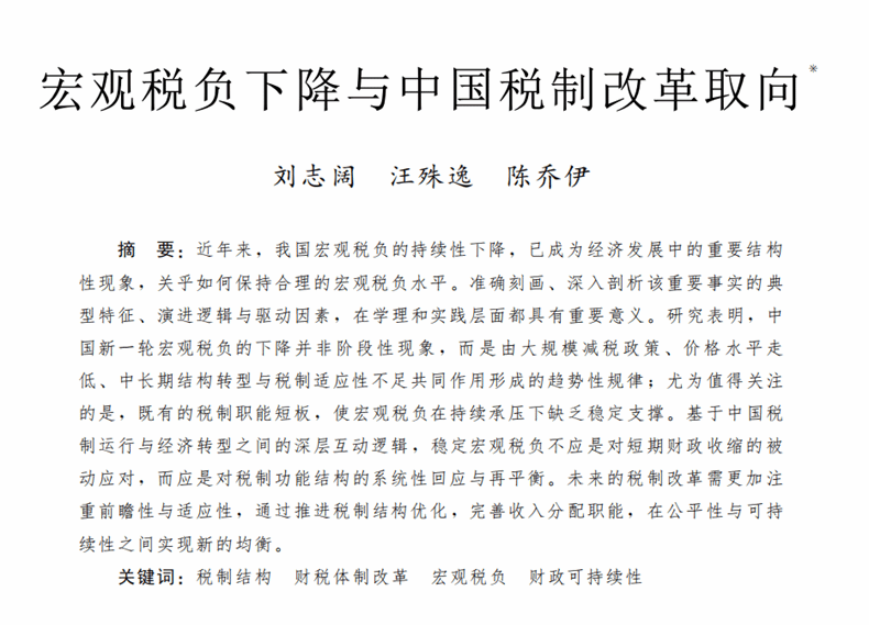 近日,复旦大学经济学院刘志阔教授、汪殊逸博士后及陈乔伊助理教授的合作论文《宏观税负下降与中国税制改革取向》在《中国社会科学》2026年第2期刊出。