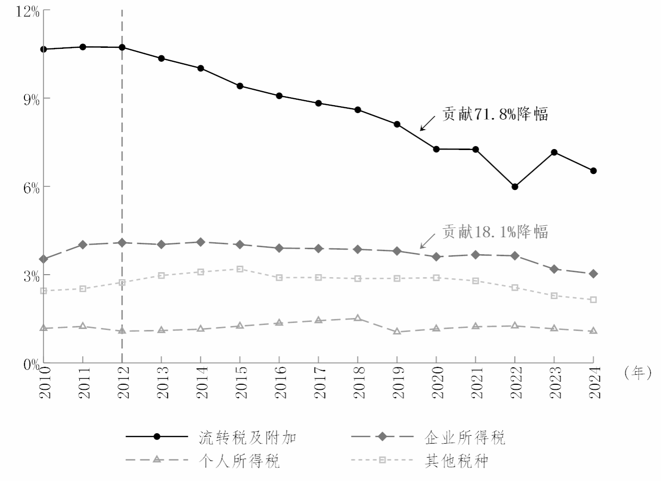 首先,税制结构优化是本轮减税的主线。分税种来看,流转税是减税降负的最主要来源,贡献了71.8%的税负降幅;企业所得税贡献了18.1%,二者合计解释了近九成的宏观税负下降(如图2所示)。其中,增值税改革尤为关键。2012年启动的“营改增”并于2016年全面推开,消除了增值税与营业税双轨并行带来的重复征税;2017—2019年连续实施三轮税率简并,将最高档税率由17%降至13%;2019年起逐步推开留抵退税,2022年退税规模突破2.4万亿元。围绕增值税的一系列改革相互衔接、持续推进,构成了这一轮大规模减税的核心政策。
