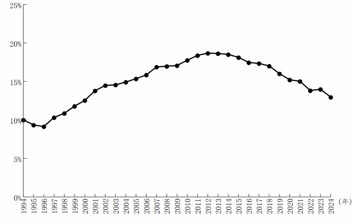 宏观税负是衡量政府财政能力的核心指标,也是国际比较和宏观调控评估中不可或缺的关键变量。从国际经验看,大多数经济体的宏观税负在过去数十年里呈稳步上升态势——政府职能不断扩张、公共支出需求持续增长,共同推高了宏观税负水平。然而,中国在过去十余年走出了一条截然不同的轨迹:以“税收收入占GDP比重”衡量的宏观税负自2012年以来持续下降,至2024年已回落至21世纪初的水平(如图1所示)。无论从变化幅度还是持续时间来看,这在全球主要经济体中都极为罕见。