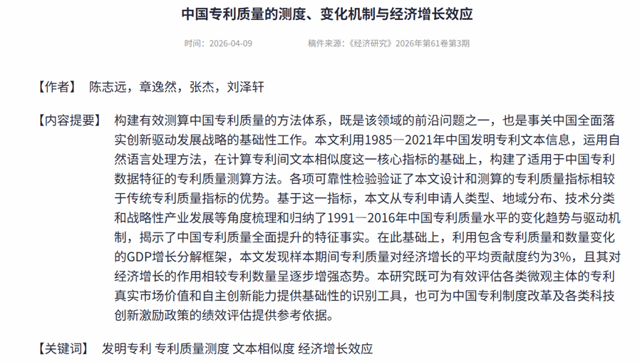 复旦大学经济学院章逸然助理教授的合作论文《中国专利质量的测度、变化机制与经济增长效应》在《经济研究》2026年第3期发表。