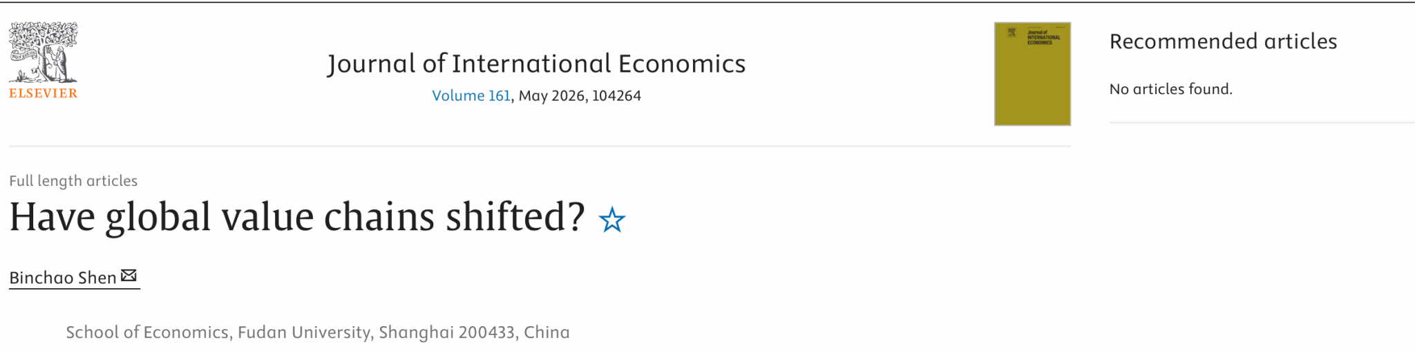 近期,复旦大学经济学院沈彬朝博士生的研究论文Have global value chains shifted?(全球价值链转移了吗?)在国际经济学领域权威期刊Journal of International Economics在线发表。