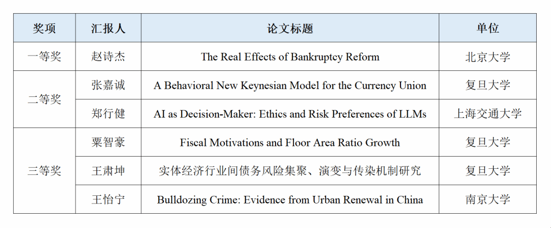 在论文汇报环节,来自多所高校的6位优秀博士生依次汇报了他们的研究成果。复旦大学的粟智豪考察了地方财政动机对住宅容积率调节的影响,发现土地收入分成减少会促使地方政府转向商业用地分配,并通过提高住宅容积率强化土地利用。南京大学的王怡宁基于深圳城市更新的研究发现,改造政策可使城中村犯罪率下降80%,且犯罪抑制效应具有空间外溢性。复旦大学的张嘉诚从行为宏观视角探讨汇率制度,指出在认知贴现假设下,固定汇率在常规时期有助于预期管理,而在零利率下限环境中灵活汇率反而可能放大冲击。北京大学的赵诗杰通过构建企业破产数据库发现,设立专门破产法院显著提升了无担保债权回收率,并带动当地信贷扩张与企业投资改善。复旦大学的王肃坤从债券市场联动切入,构建多维风险传染网络,揭示了实体经济债务风险的集聚与传染机制,为防范系统性风险提供参考。上海交通大学的郑行健通过对50个大语言模型的行为实验发现,对齐调整虽提升模型安全性,但也可能因过度风险规避导致经济决策趋于保守。