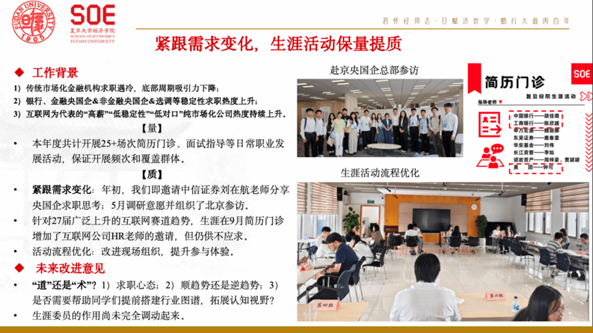 紧扣就业需求,推动生涯服务保量提质。年度开展简历门诊、面试指导等活动25场以上;通过邀请行业嘉宾、组织企业参访、对接优质HR资源等方式,拓展学生职业视野与求职渠道,并持续优化活动流程与参与体验。