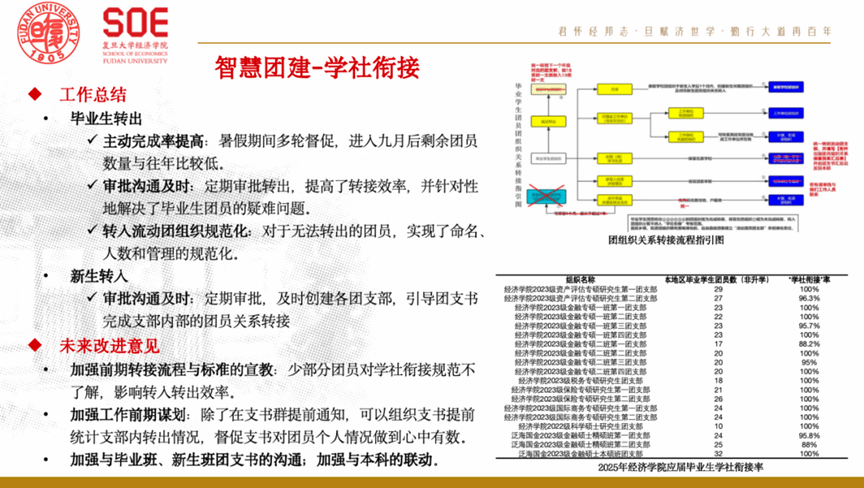 聚焦团务基础工作,着力提升服务效能。通过暑期持续督促、定期沟通审批,提升了毕业生团组织关系转接效率,并对特殊情况实现了规范管理;新生转入方面,及时建立团支部并指导完成内部转接。同时,常态化推进“复兴壹号”团费收缴与专题学习,建立党团实践报名机制,制定团支书考评细则,推动团务管理向制度化、常态化迈进。