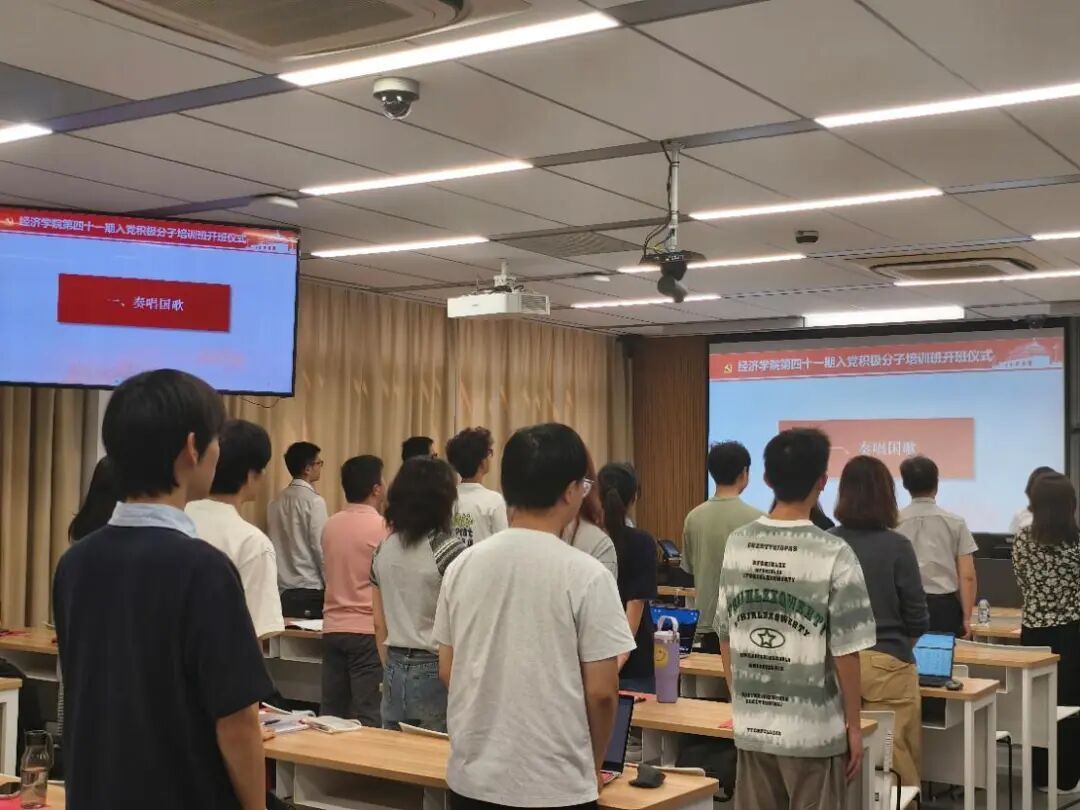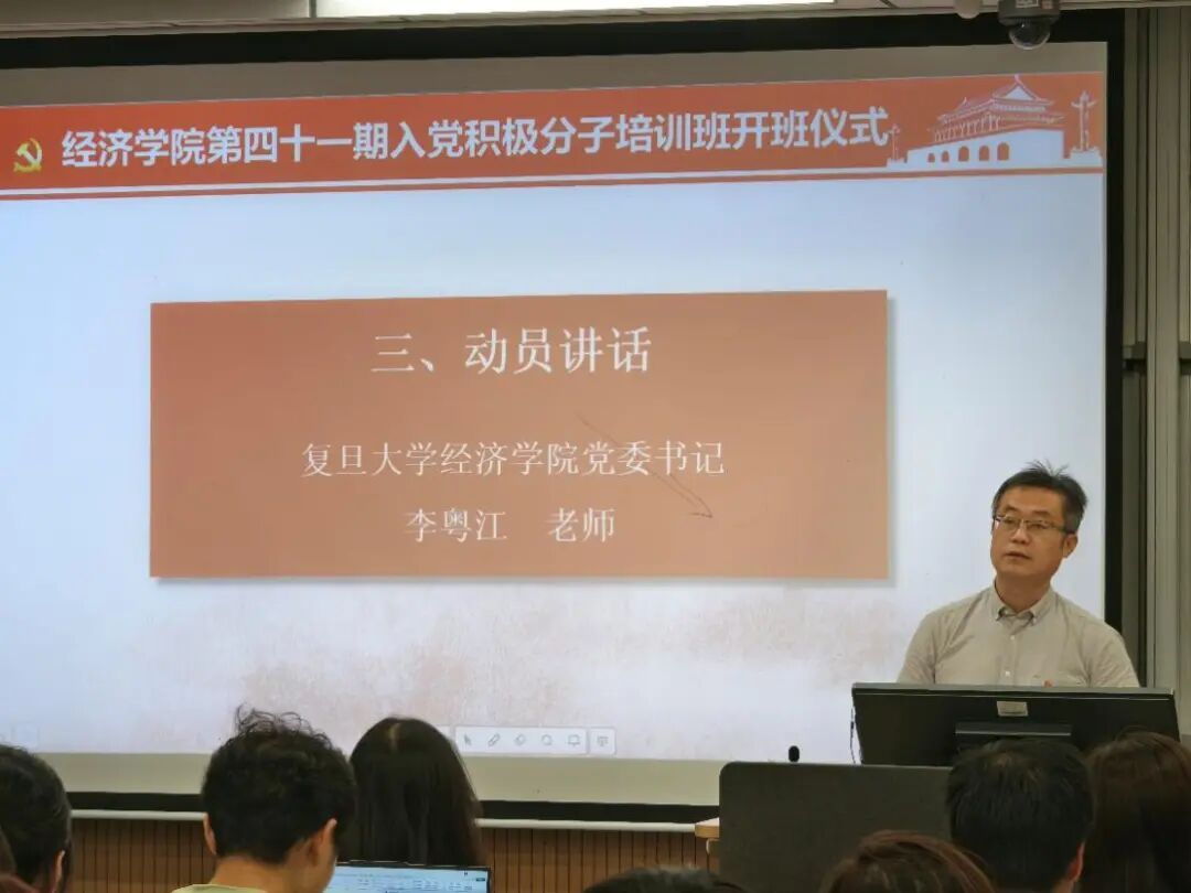 2025年9月28日下午,复旦大学经济学院第四十一期入党积极分子培训班开班仪式于邯郸校区第六教学楼H6108教室隆重举行。经济学院党委书记李粤江老师、党委副书记张馨老师、专职辅导员王蕾明老师和经济学院党建职能辅导员彭顾逸老师出席,仪式由25级本科生须籽萌同学主持。