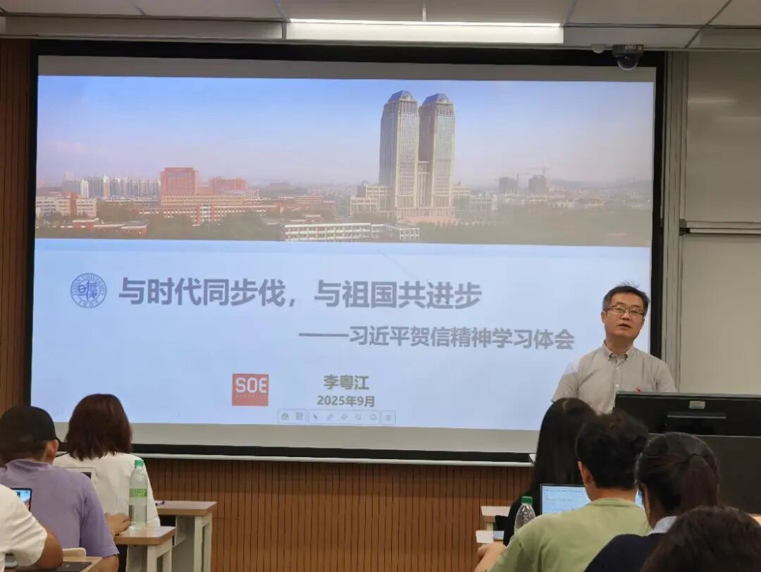 在《与时代同步伐,与祖国共进步——习近平贺信精神学习体会》课程中,李粤江书记围绕习近平贺信精神,系统回顾了复旦大学120年来与时代同行、与祖国共进的奋斗历程,深刻阐释了复旦大学扎根中国大地、服务民族复兴的使命担当;通过梳理从鸦片战争到中国共产党成立、从革命斗争到新中国建设、从改革开放到新时代的历史脉络,弘扬了伟大建党精神、井冈山精神、长征精神、抗战精神、延安精神、“两弹一星”精神、改革开放精神等中国共产党人的精神谱系;重点展现了复旦大学特别是经济学院在人才培养、学科建设、科研创新、服务国家战略和国际交流合作等方面的卓越成就,强调要坚持立德树人、推动“双一流”建设,深化教育改革,强化科技自立自强与人才自主培养,不断提升服务国家重大战略和区域经济社会发展能力,为实现中华民族伟大复兴的中国梦贡献智慧与力量。