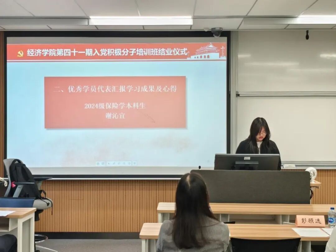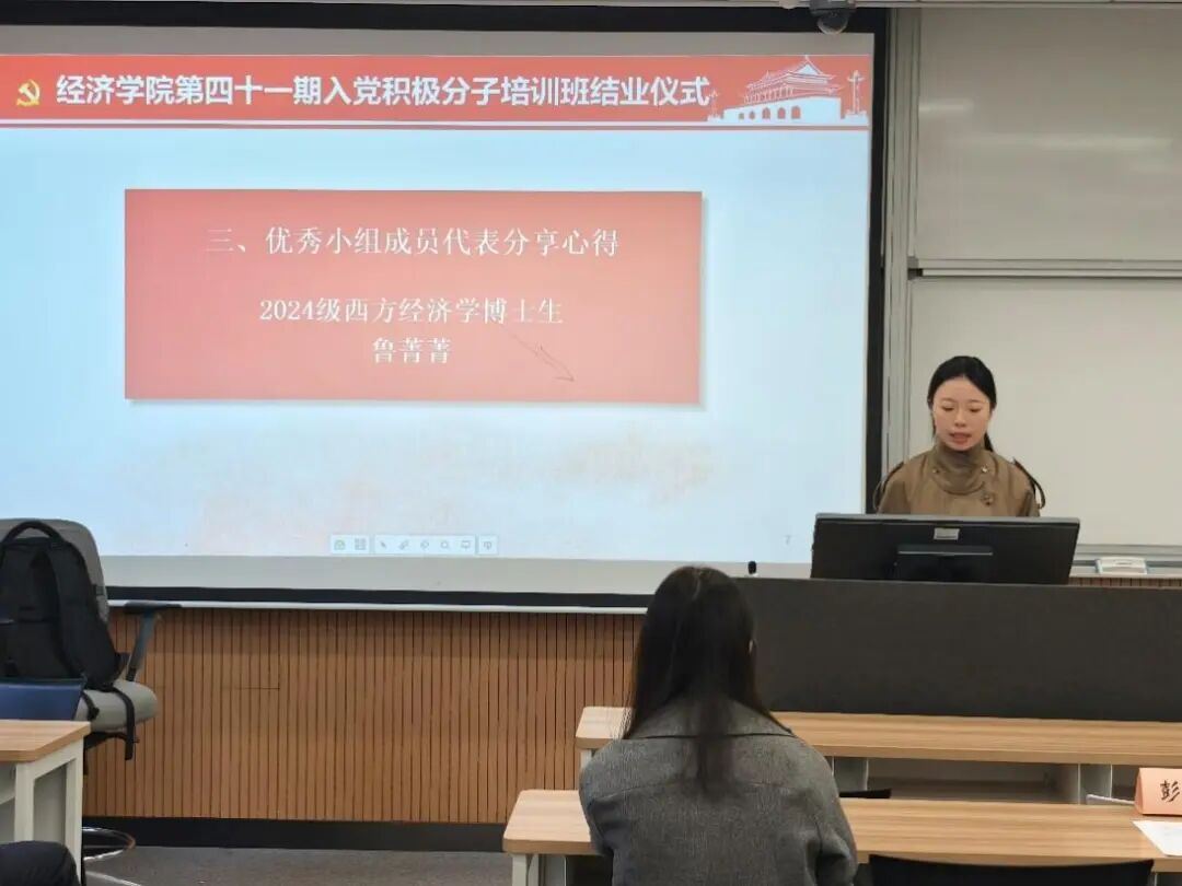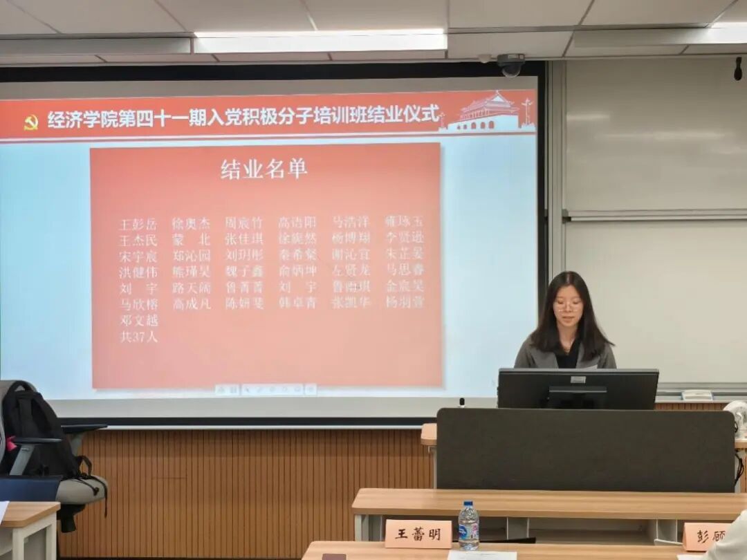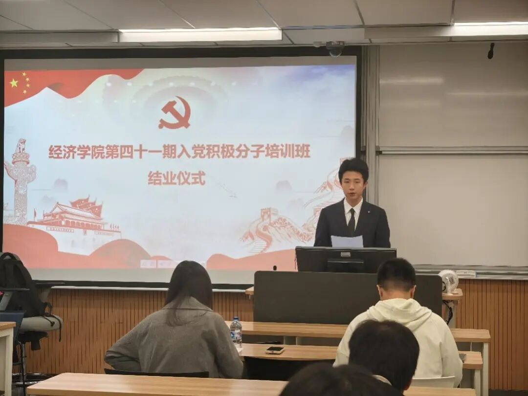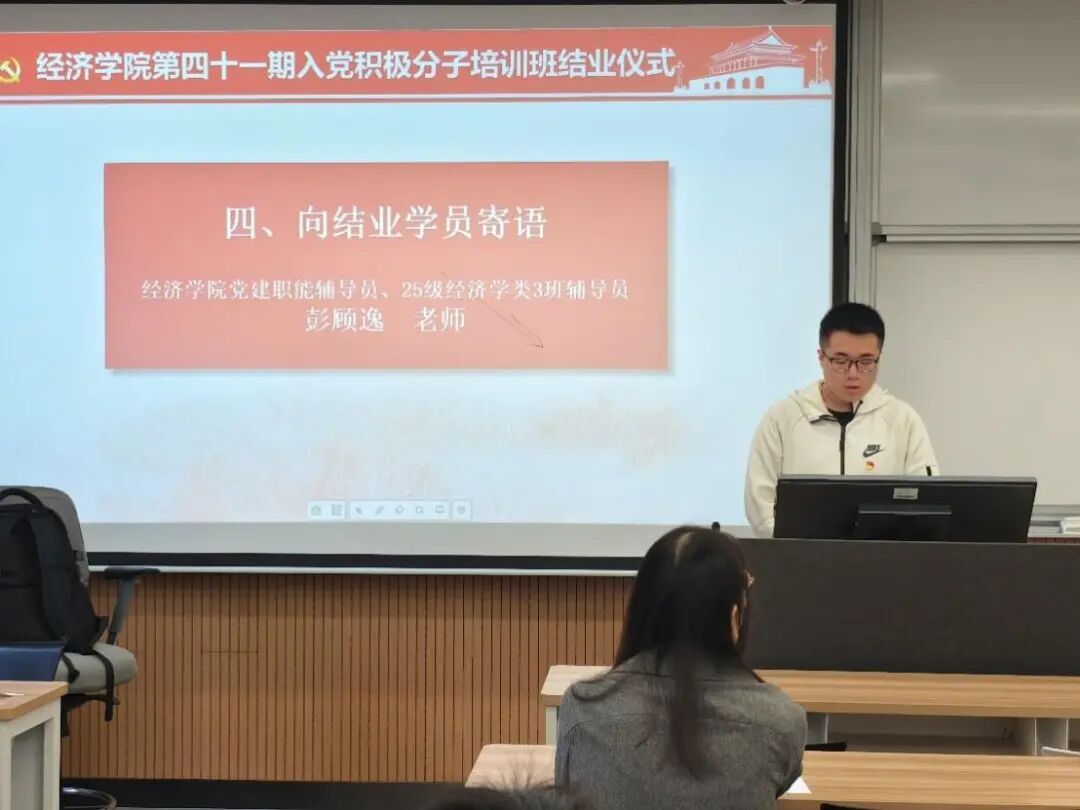2025年10月21日下午,经济学院第41期入党积极分子培训班结业仪式在6108教室举行。经济学院专职辅导员王蕾明老师、经济学院本科生辅导员彭顾逸老师出席,培训班全体学员参与。本次仪式由经济学院2025级本科生白浩言同学主持。