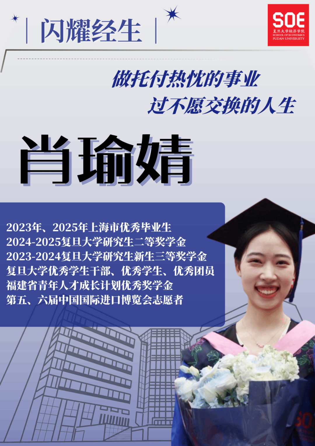肖瑜婧,复旦大学经济学院2023级国际商务专硕研究生,2019级国际经济与贸易专业本科生,任2023级国商专硕班班长,两次获得上海市优秀毕业生荣誉称号、担任进博会志愿者、参与无偿献血,多次获得复旦大学学业奖学金。她将学业追求与社会责任深度融合,在实践中彰显青年担当。