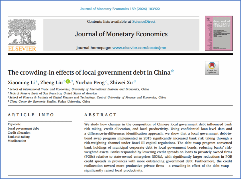 近日,复旦大学经济学院许志伟与对外经贸大学李晓明、旧金山联邦储备银行Zheng Liu、中央财经大学彭俞超的合作论文“The Crowding-in Effects of Local Government Debt...